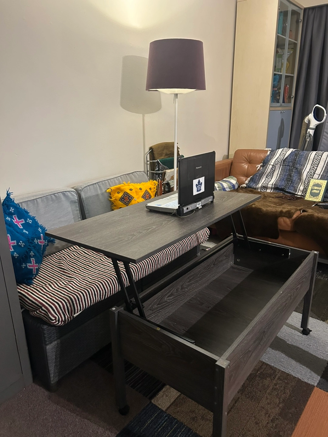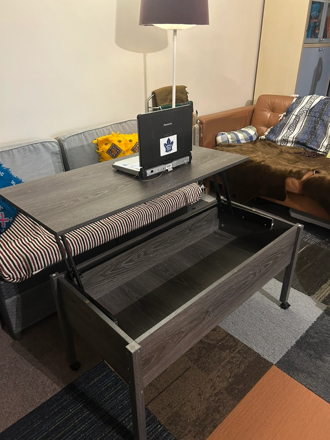 Lift top coffee table with storage. Features a lift top for working or dining. Good condition. Has a minor nick