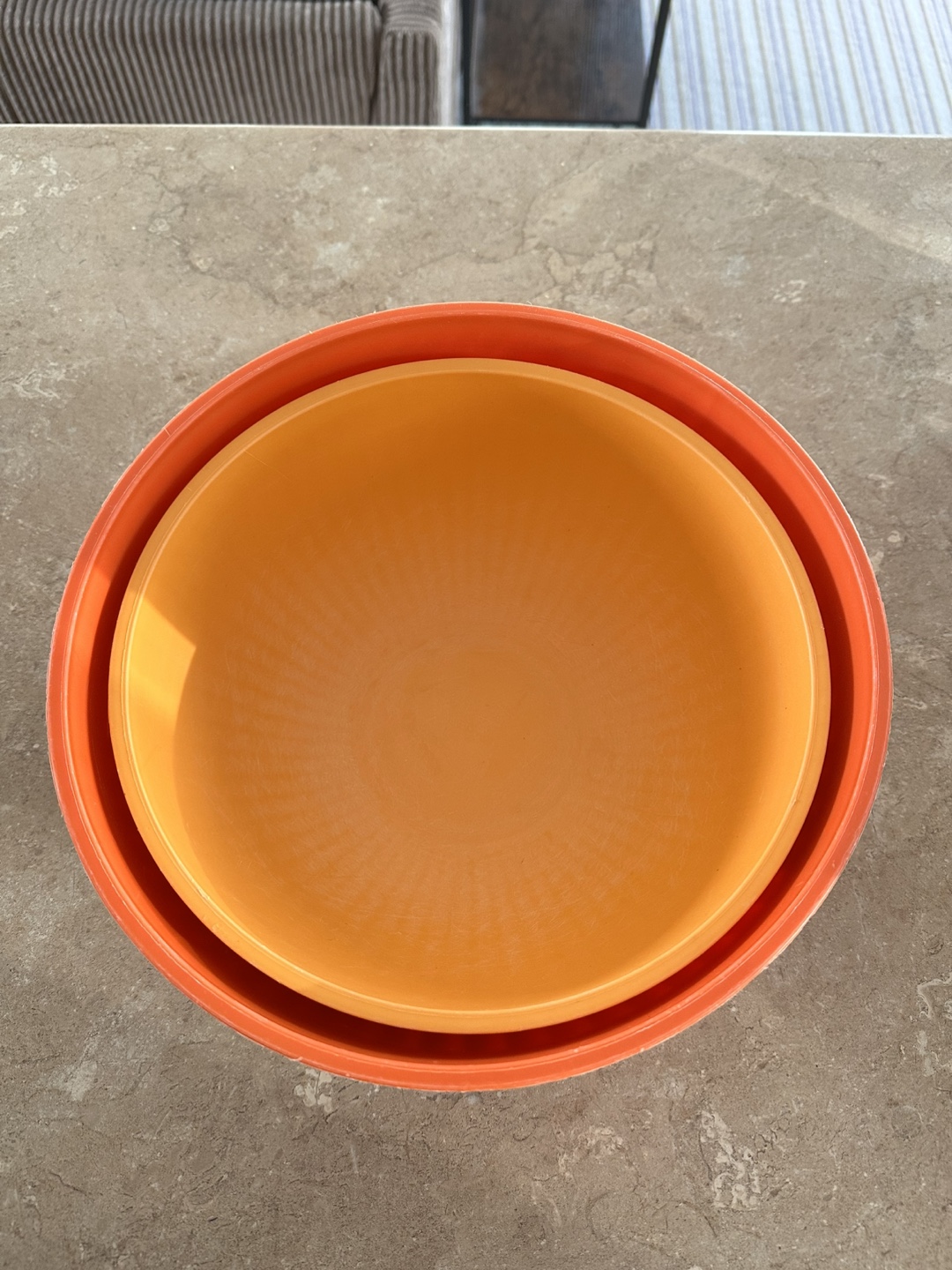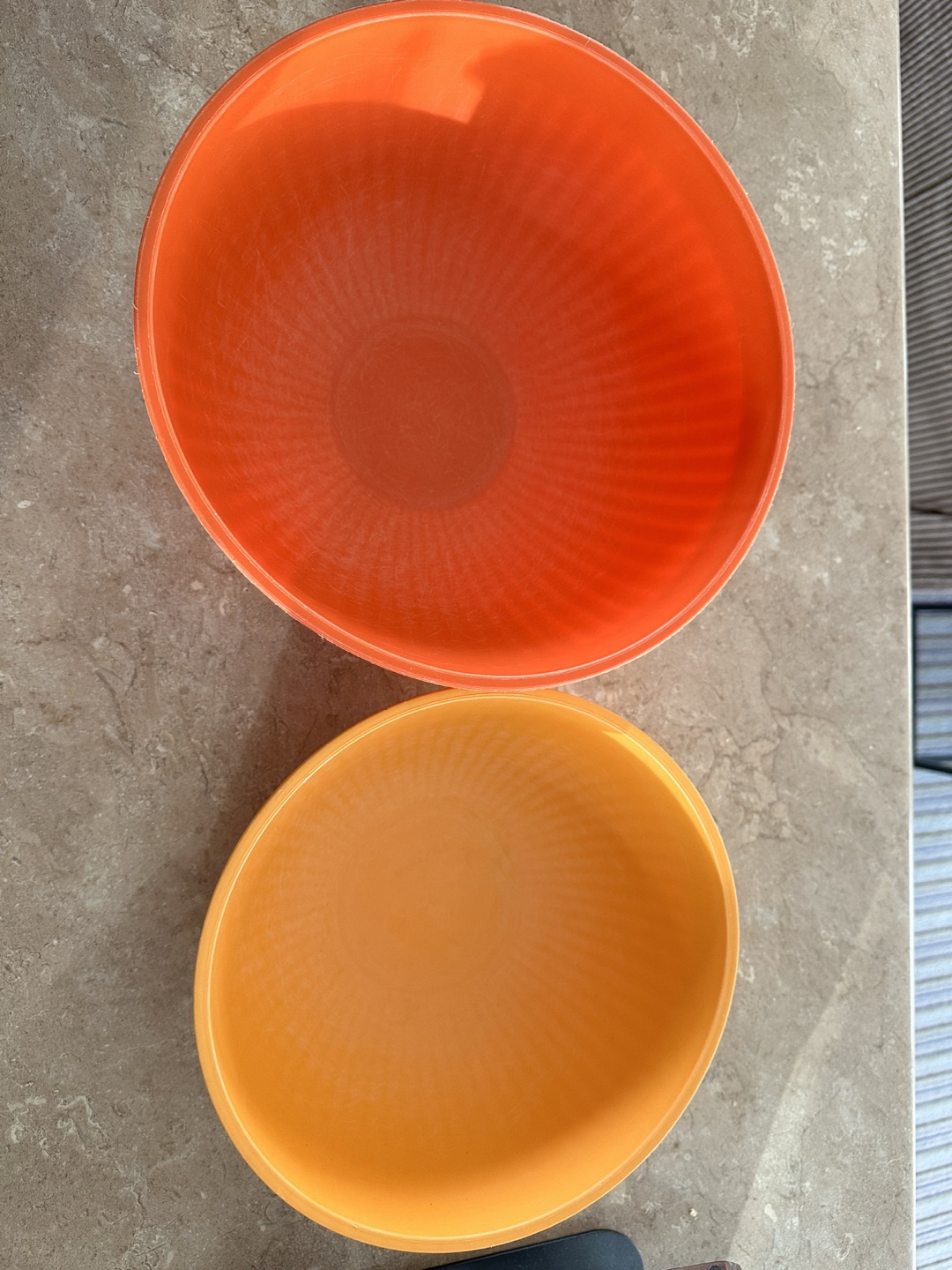 Set of 2 plastic mixing bowls. Both well loved (the colour has started to fade a bit on the bottom interior of both of them) so free to a good home!