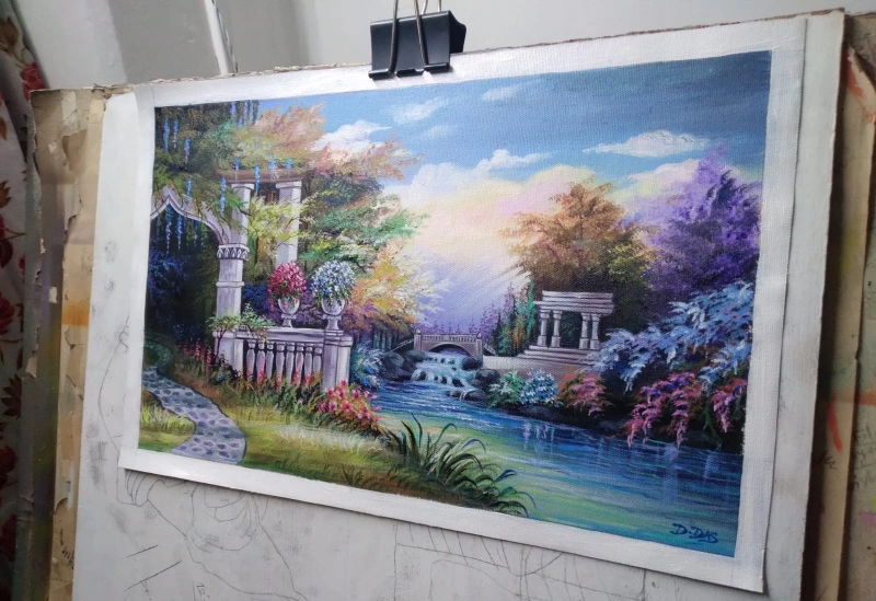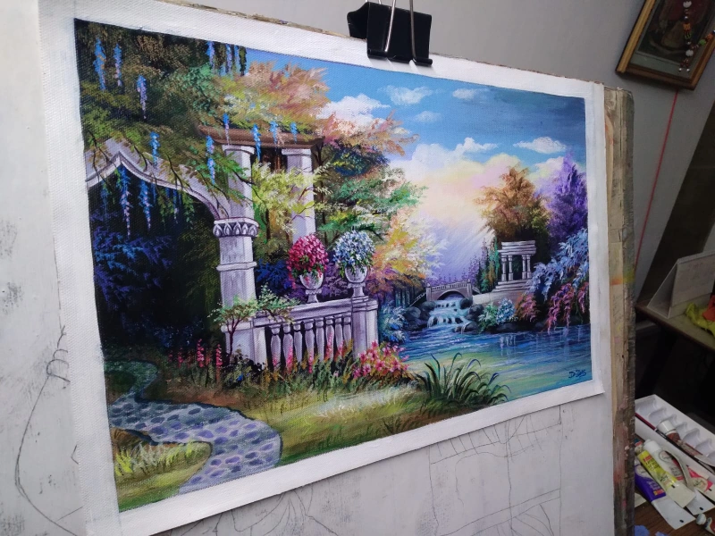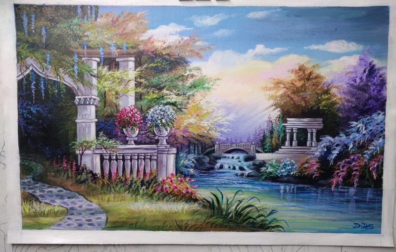 Beautiful landscape painting on canvas. Features a garden with a bridge over a river. Size : 15 inches × 9 inches Medium : Acrylic