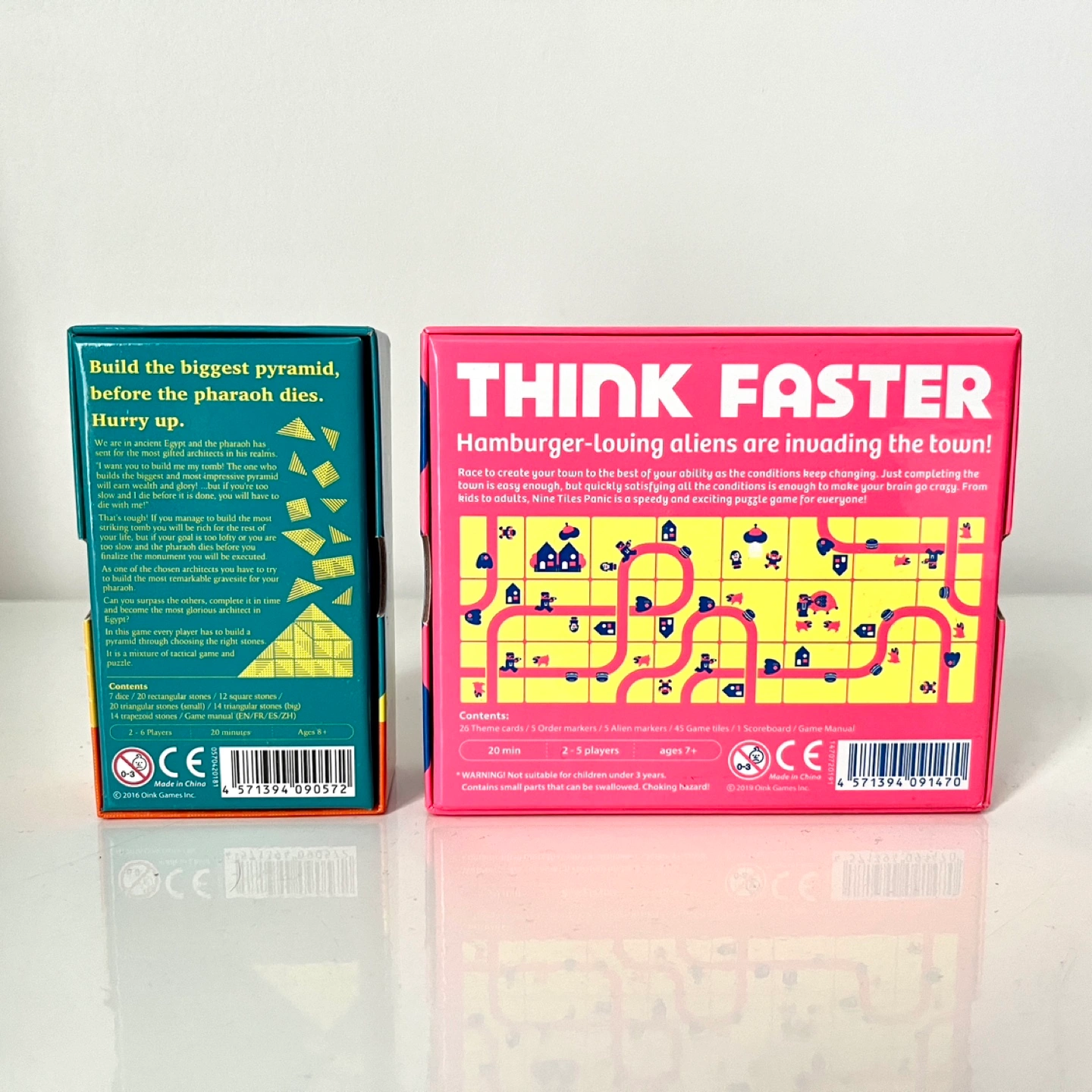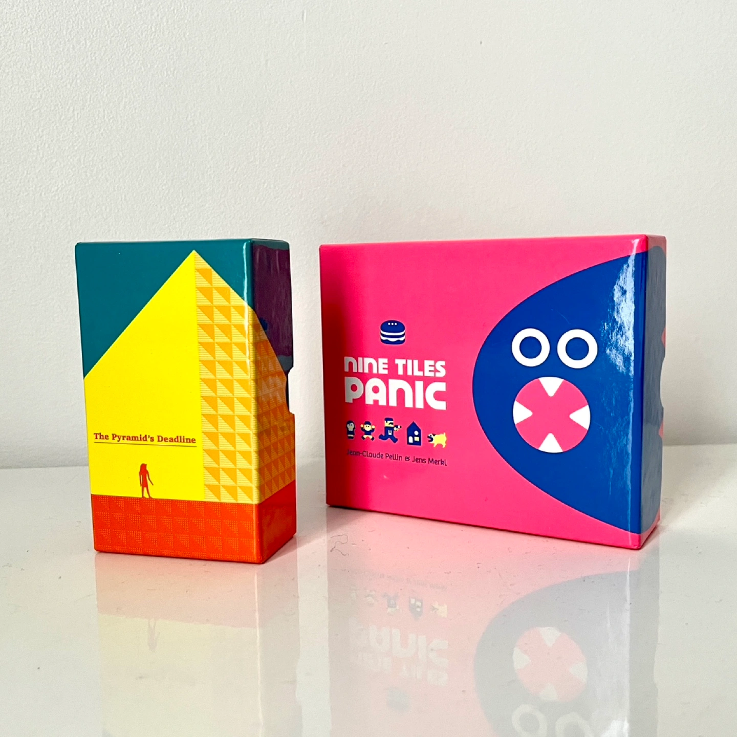 Nine Tiles Panic and The Pyramid's Deadline. Both are designed for 2-5 players, ages 7+. Takes about 20mins to play.