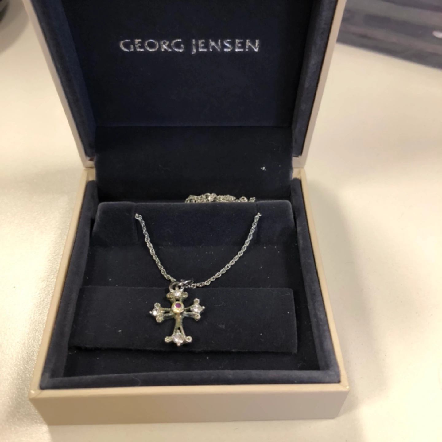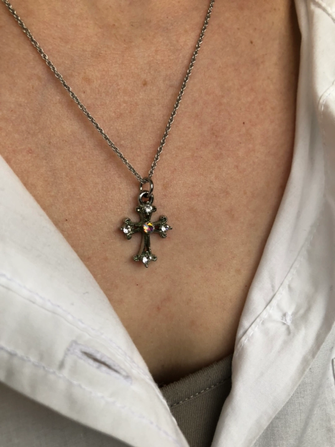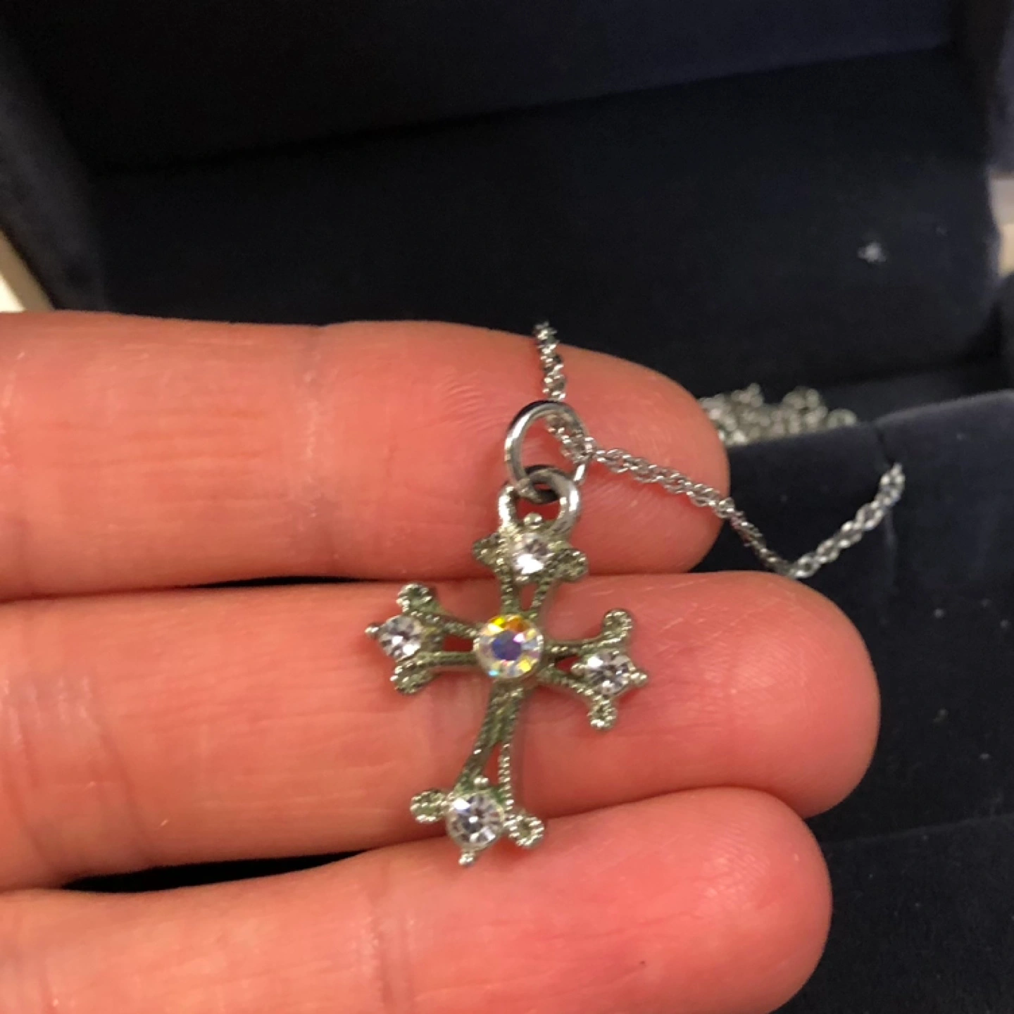 Vintage silver cross necklace with cubic zirconia stones. Comes with original box. Stones are clear and very sparkly.