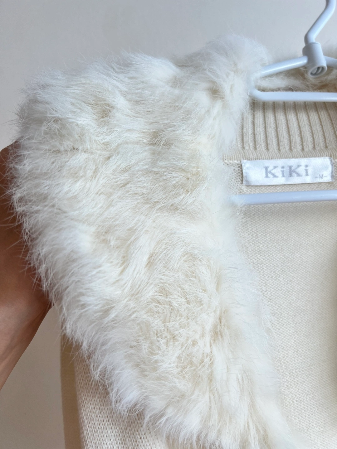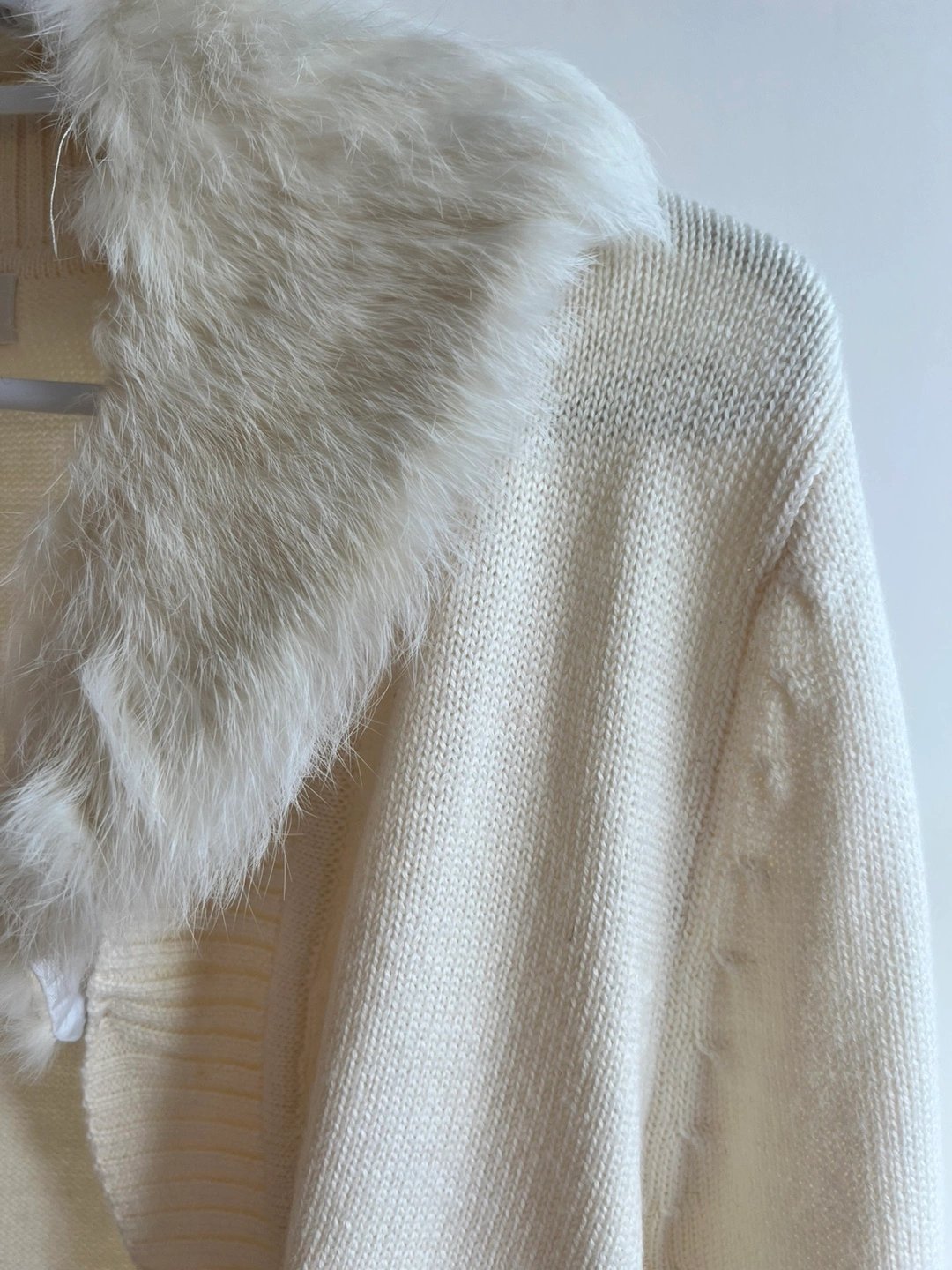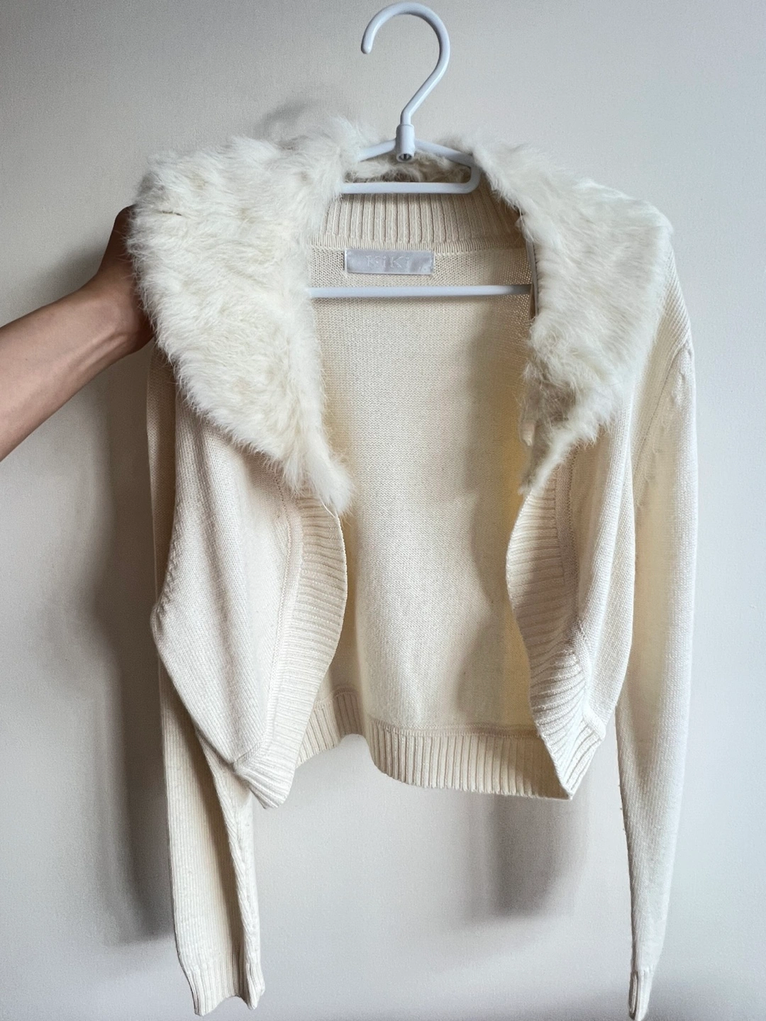 407White cardigan with a faux fur collar. Long sleeves. Size S-M. The material is very soft, and it looks adorable when worn❤️