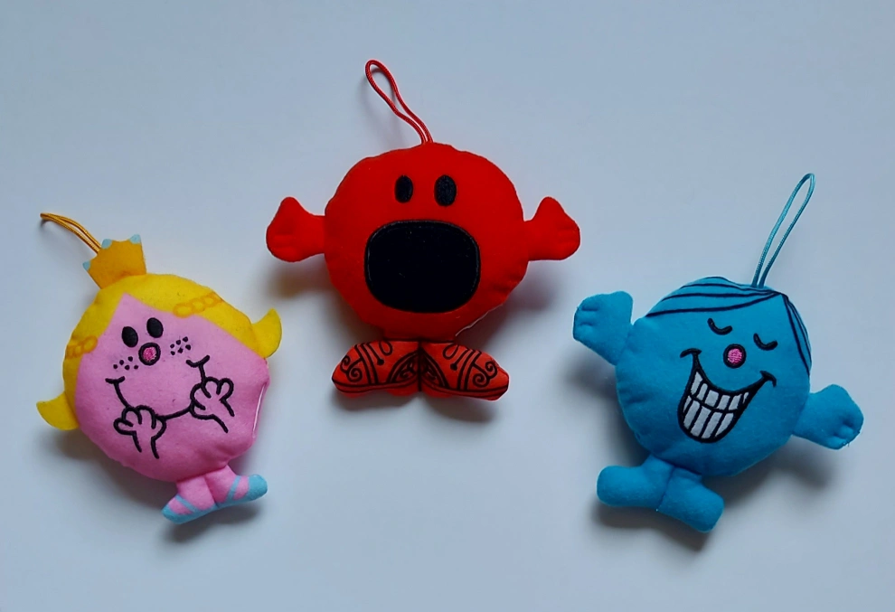 Set of three Mr. Men plush toys. One red, one blue, and one pink.