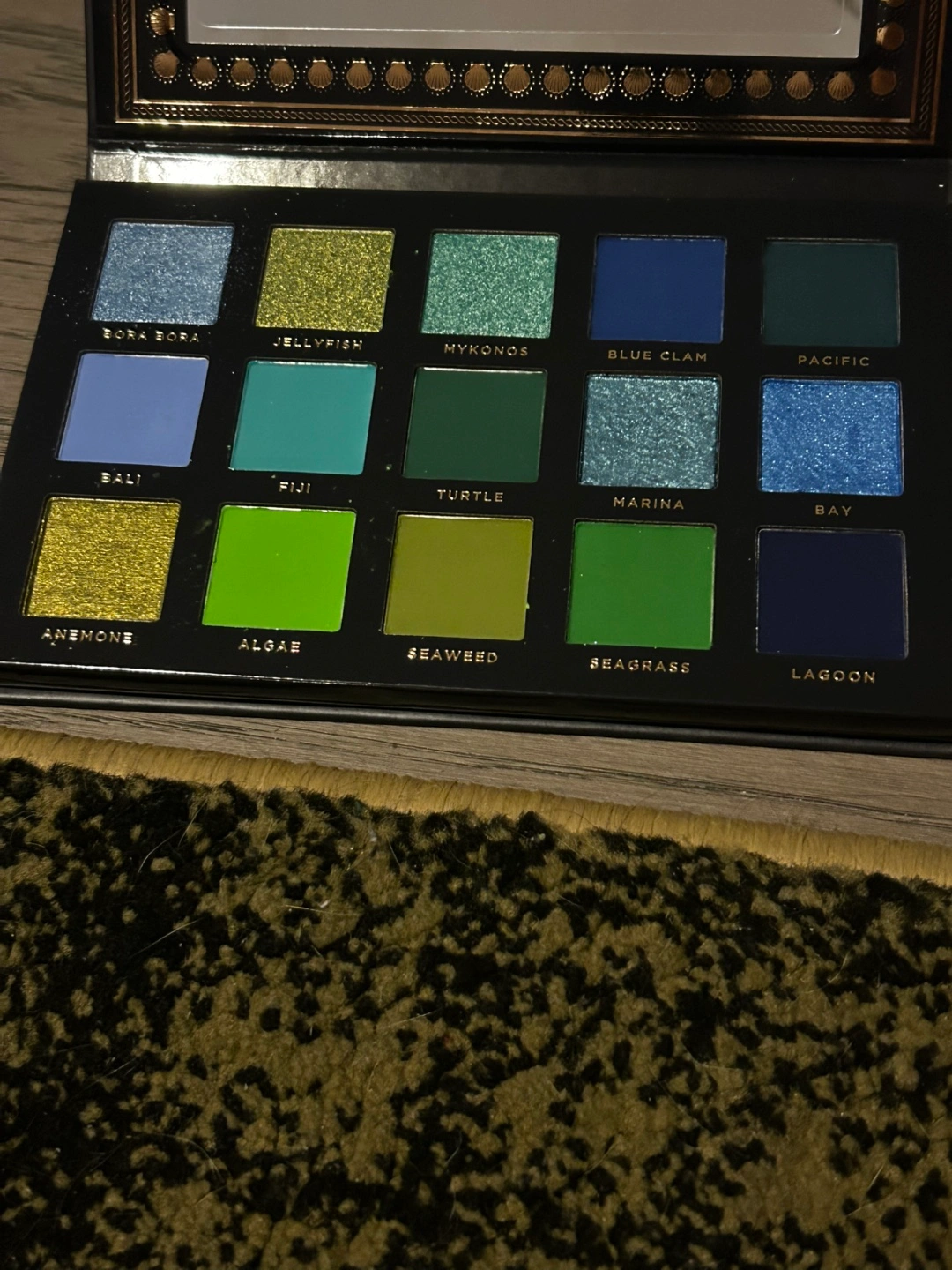 414Eyeshadow palette with 12 shades of blue and green. Includes a variety of matte and shimmer finishes. Great quality brand. Never swatched