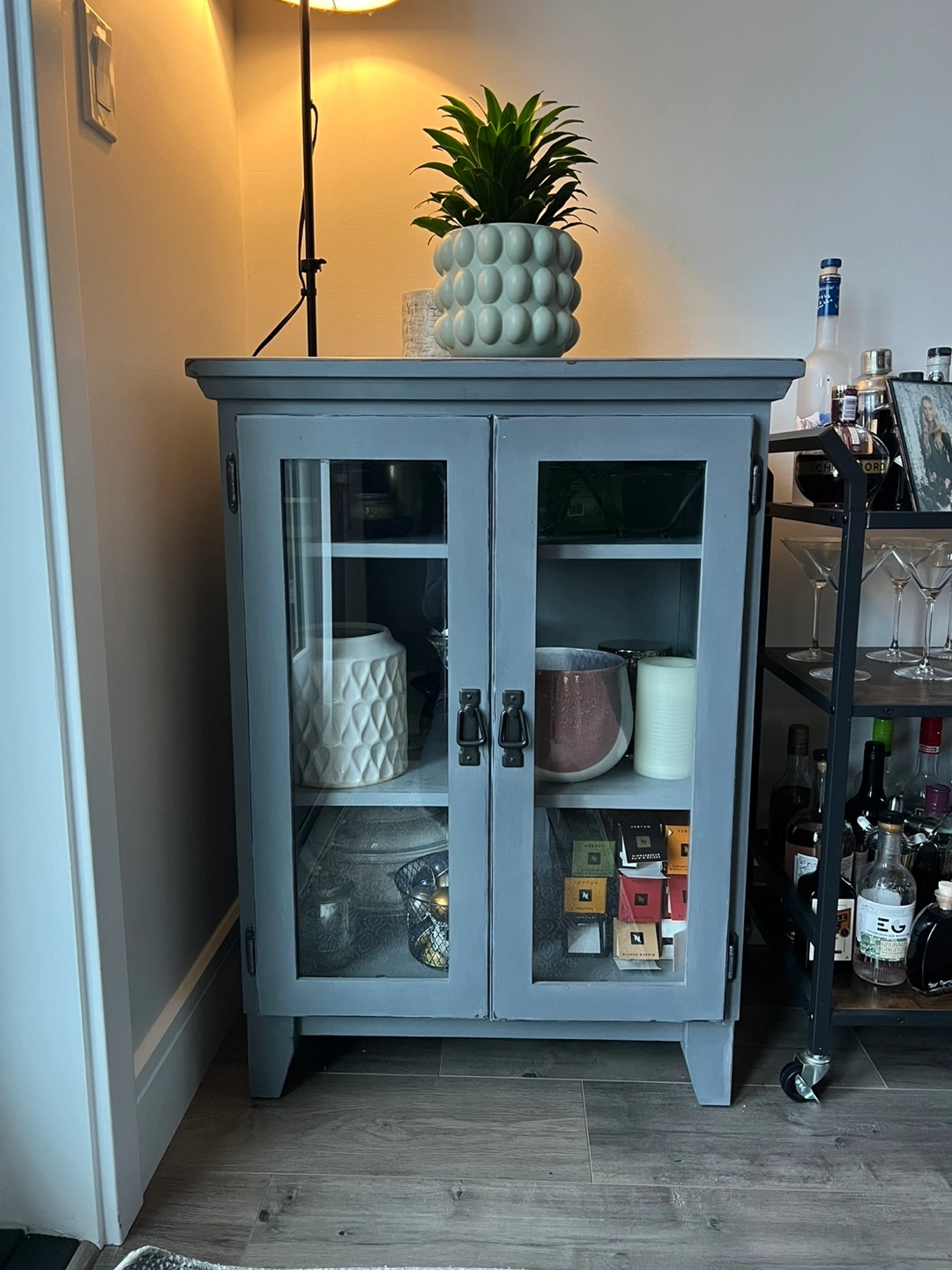 Small grey/blue wooden cabinet with glass doors and two shelves. Lightly distressed. Has black metal hinges and handles. Good condition.