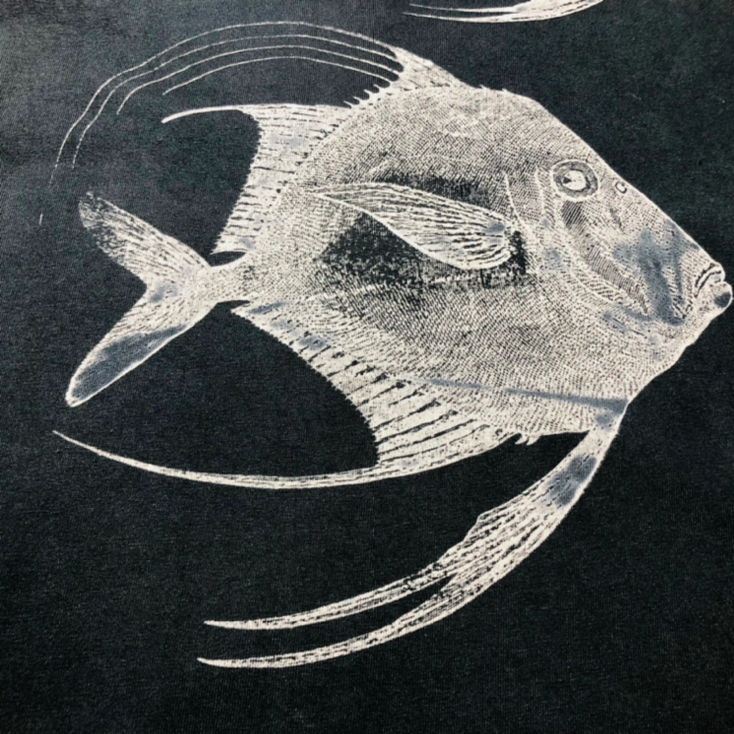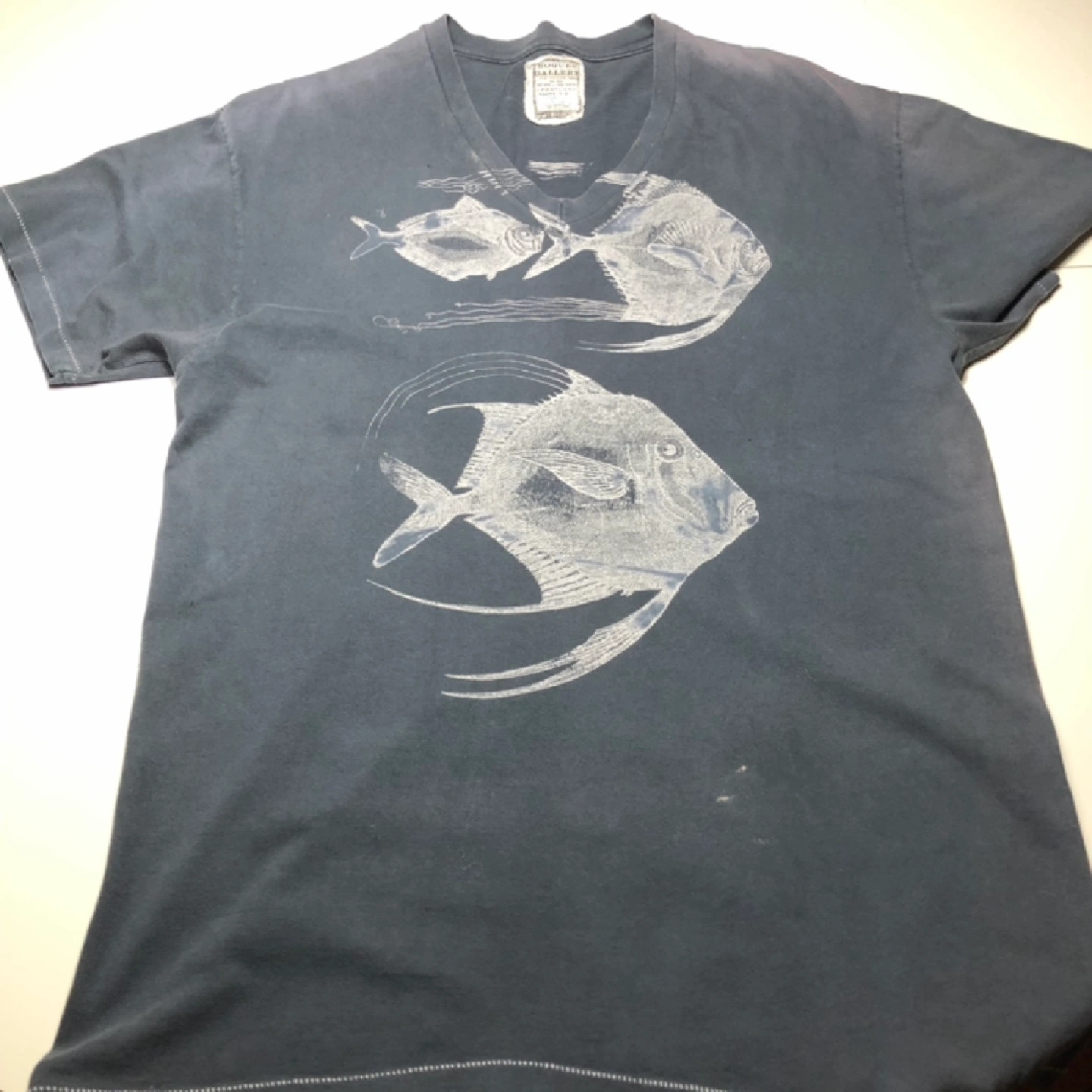 V-neck t-shirt with fish print. Deep dyed and hand printed in Portland, Maine. One-of-a-kind.