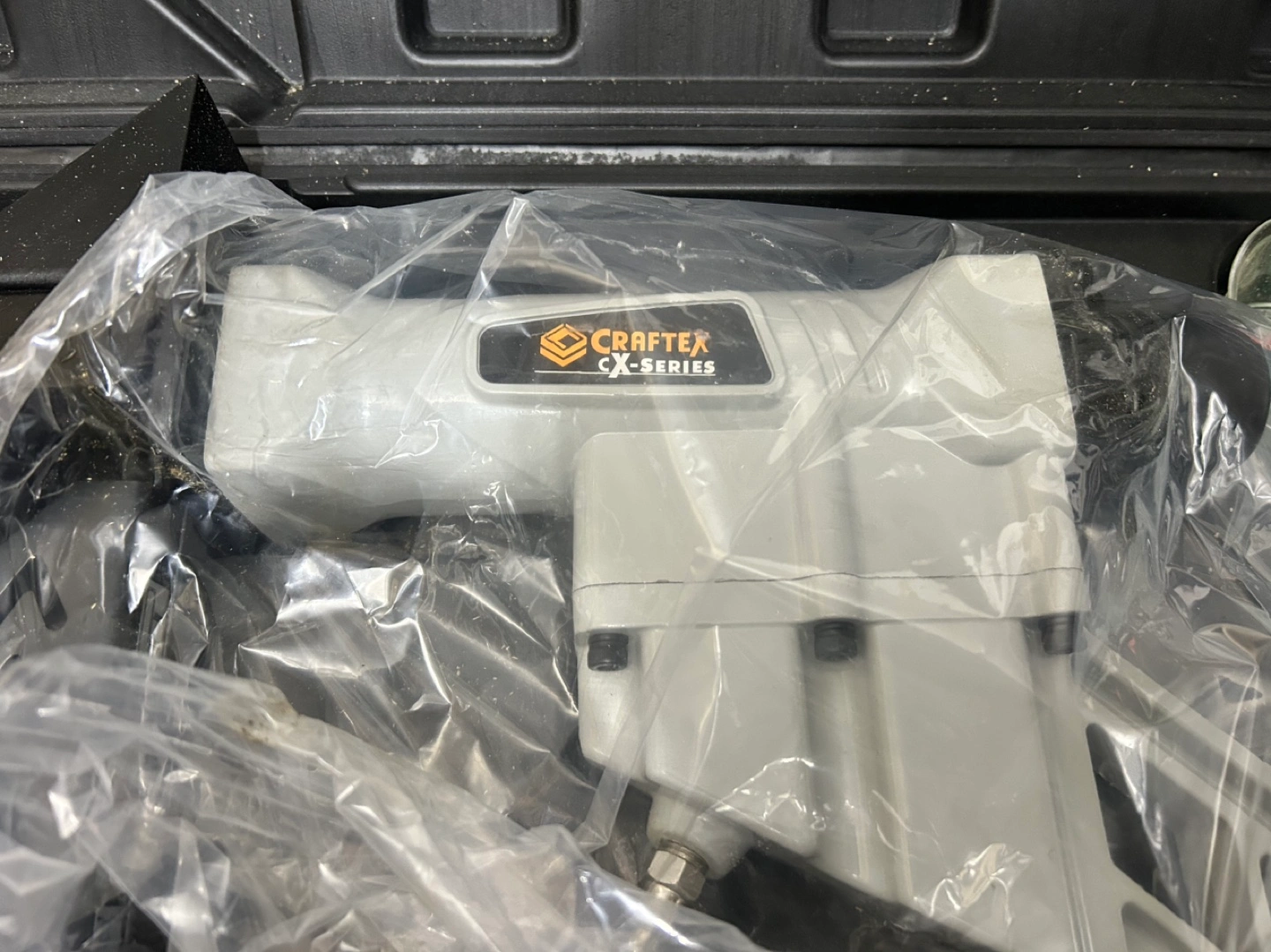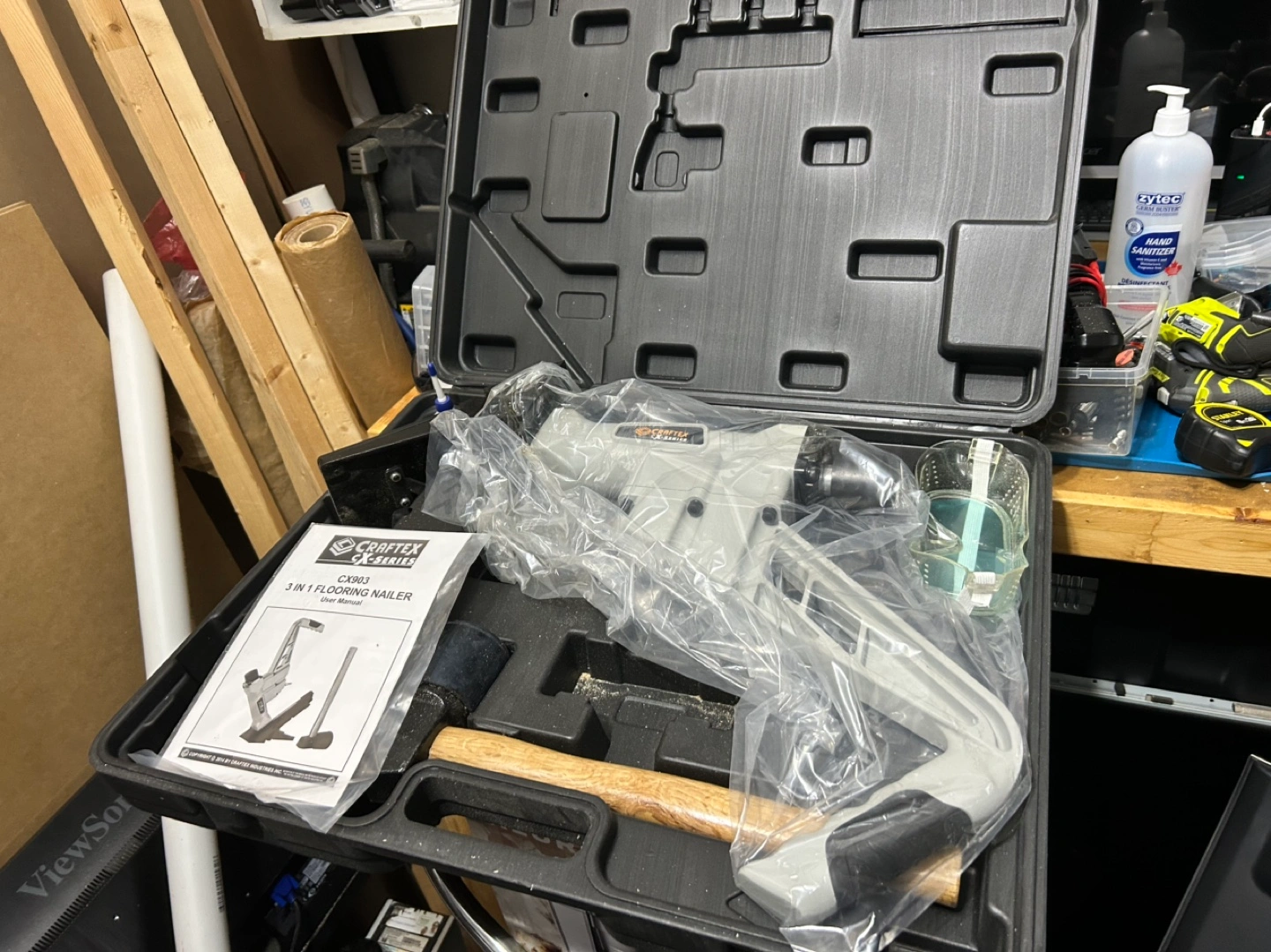 Craftex CX903 compressed air flooring nail gun. Used only once to test. Includes case, hammer, goggles, oil, instructions and gun.