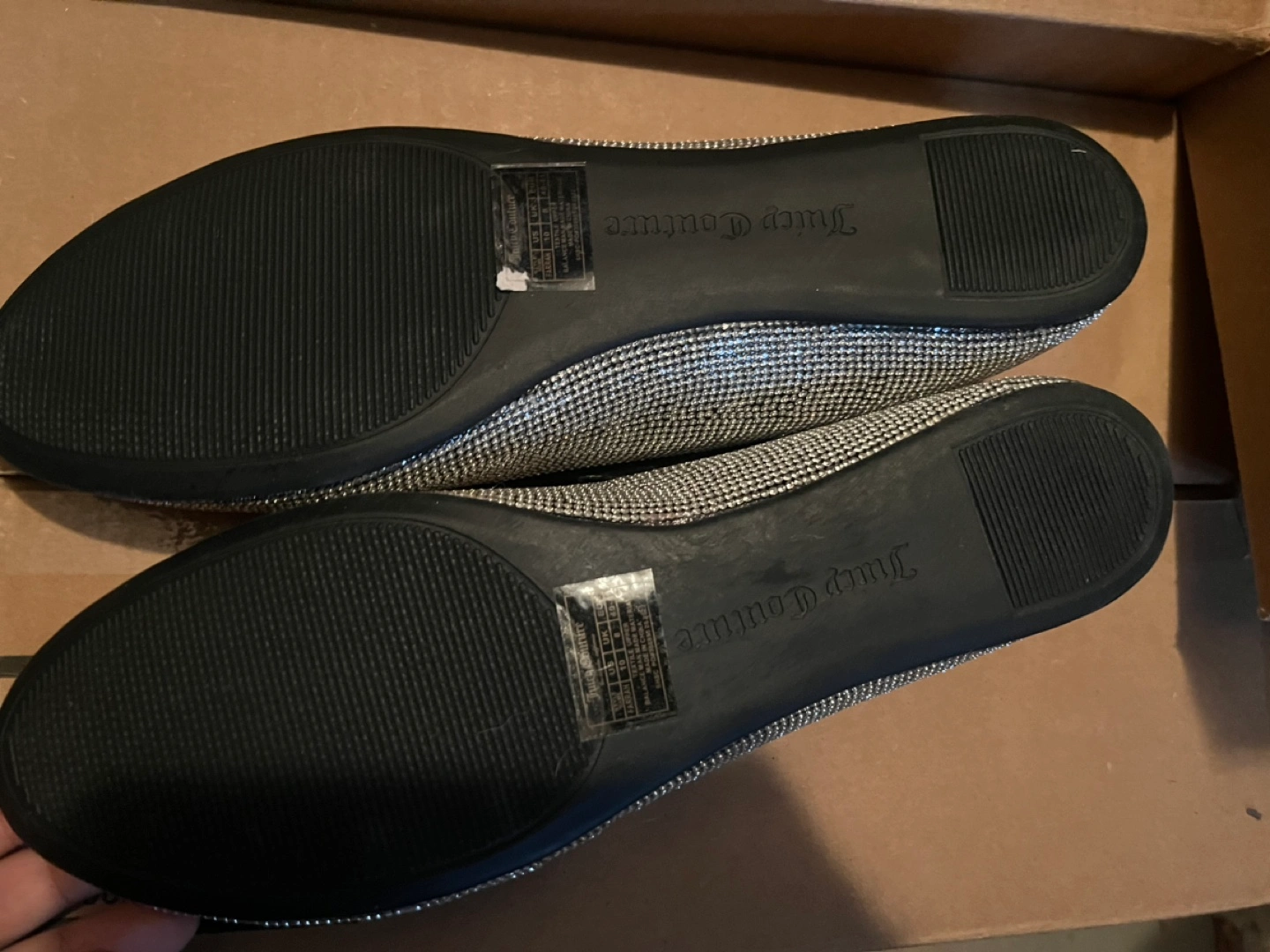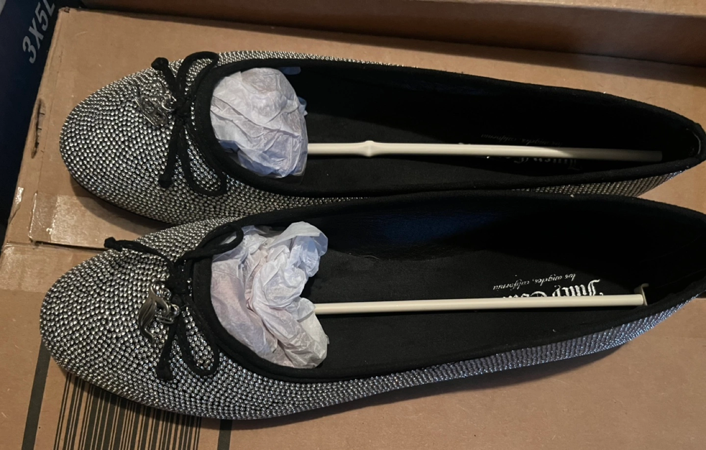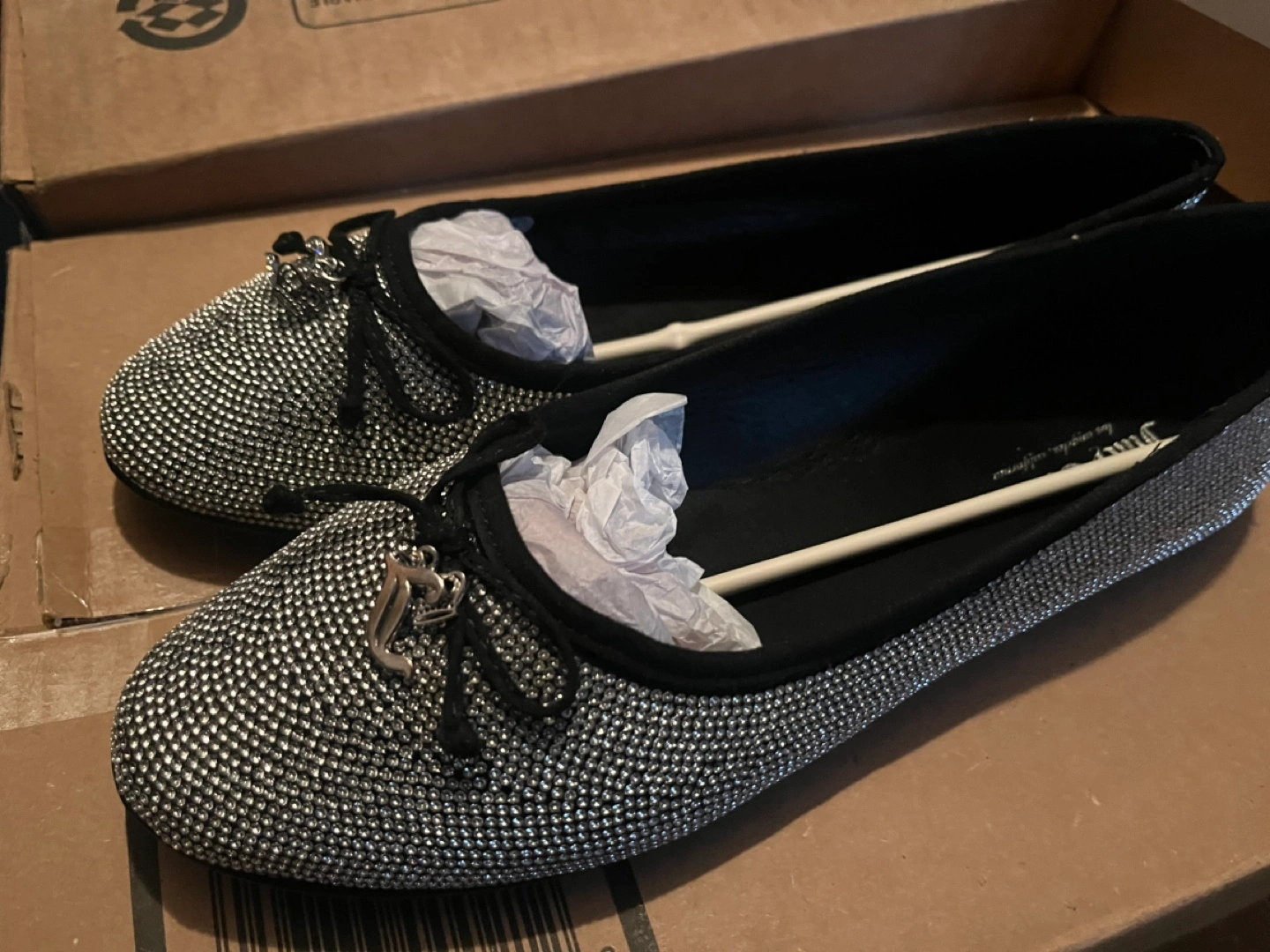 Black ballet flats with silver rhinestones. Bow detail on the toe.