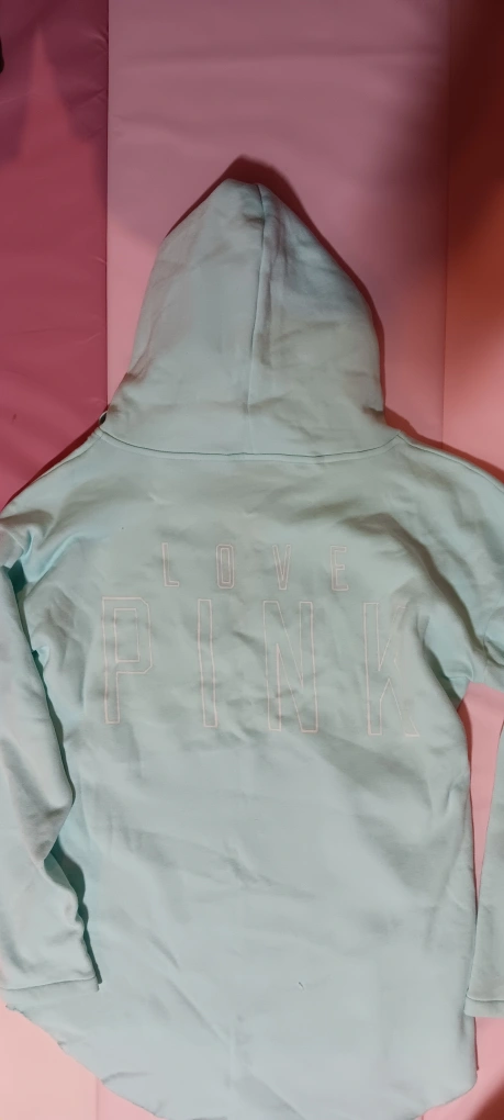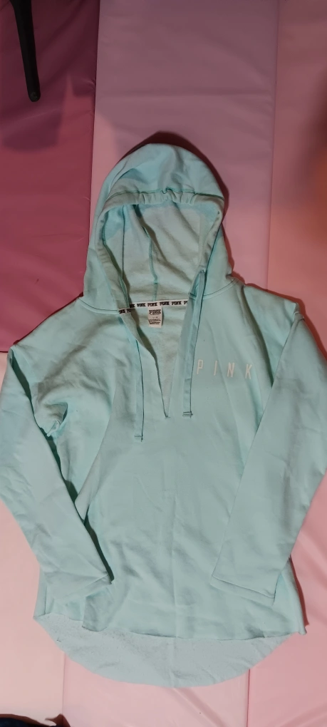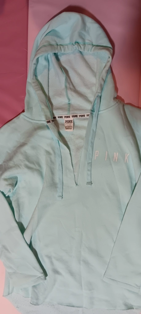 Mint green hooded sweater with a V-neck. Long sleeves and a relaxed fit.
