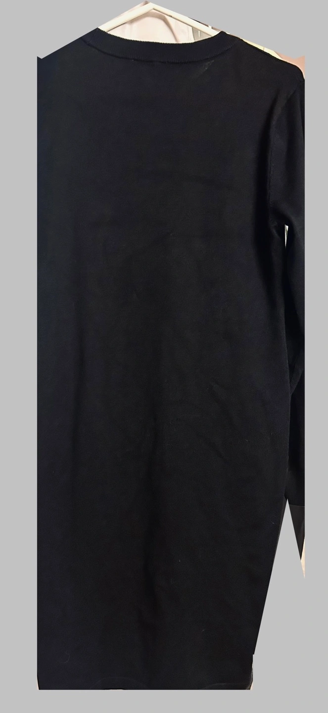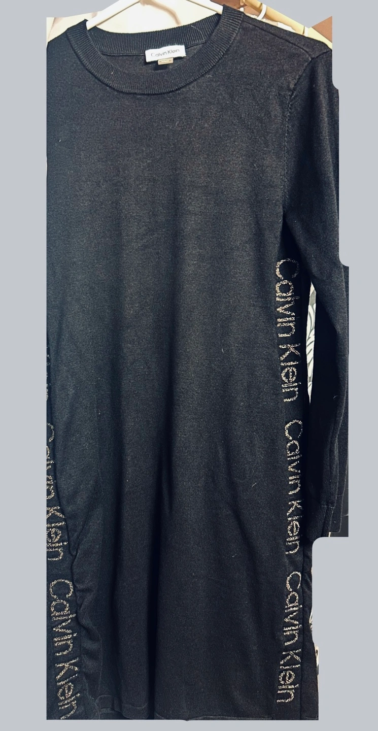 Long-sleeved black sweater dress with Calvin Klein branding. Made in China.