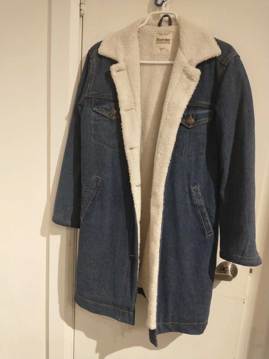 Oversized long style denim jacket with fleece lining Heavy and warm Several pockets Never worn, excellent condition Smoke free home Cash payment please