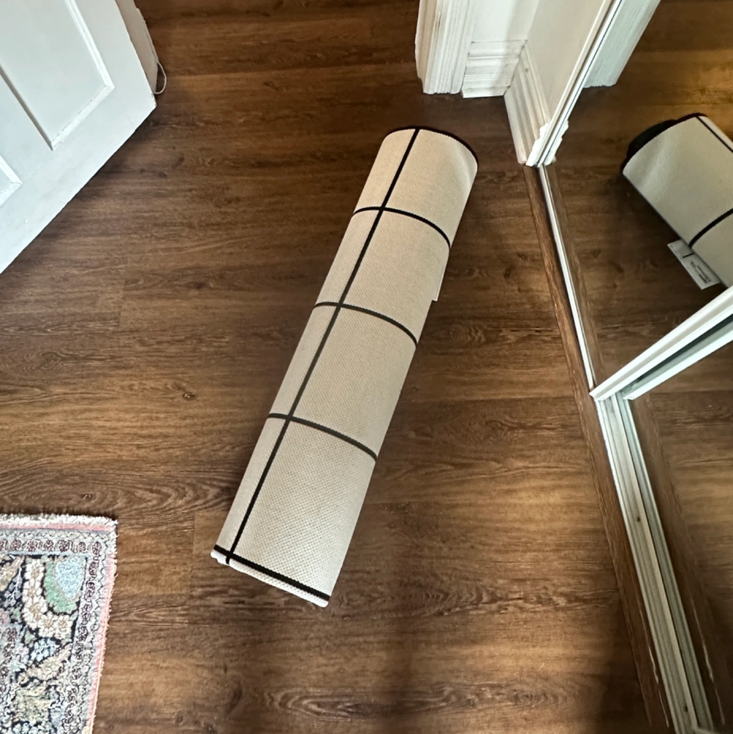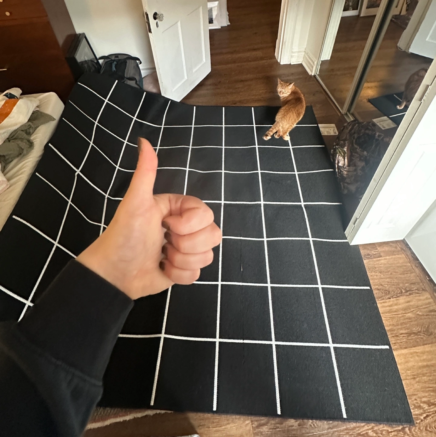 Ikea Black and white grid rug— run/rip as shown. Still good for a garage, basement or office. Rolled up for easy carry ✨