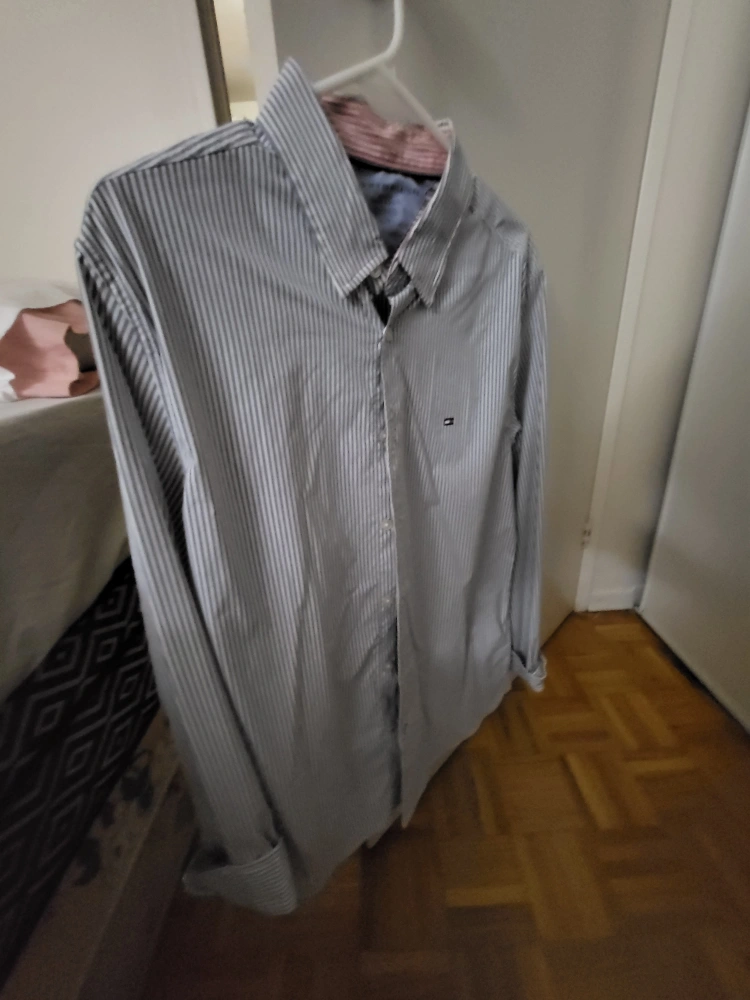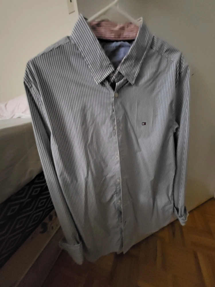 Long sleeve, button up, blue and white striped dress shirt. Slim fit.