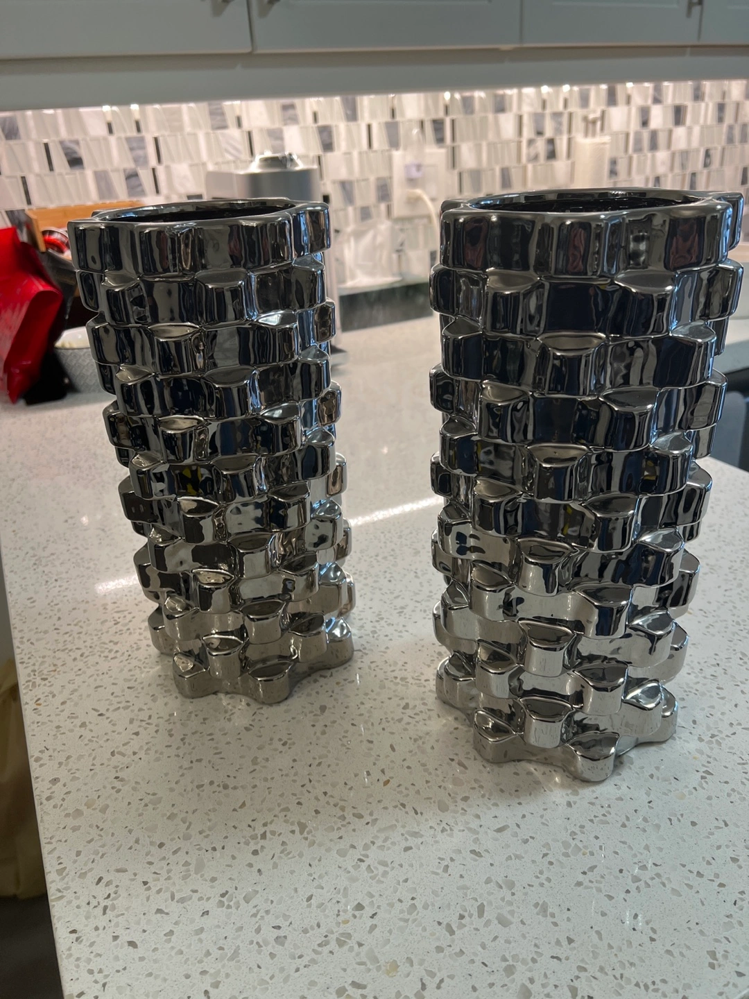 Two silver ceramic vases with a unique geometric design. Tall and narrow, perfect for displaying flowers or other decorative items.