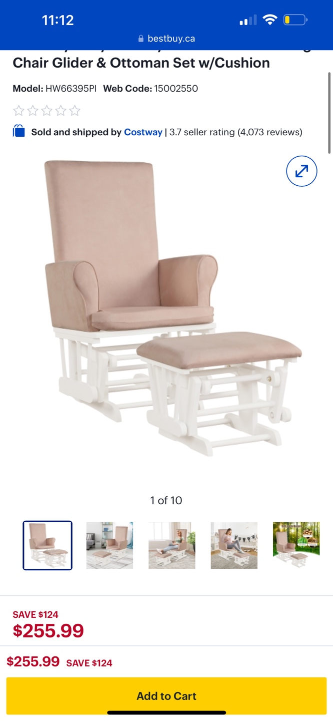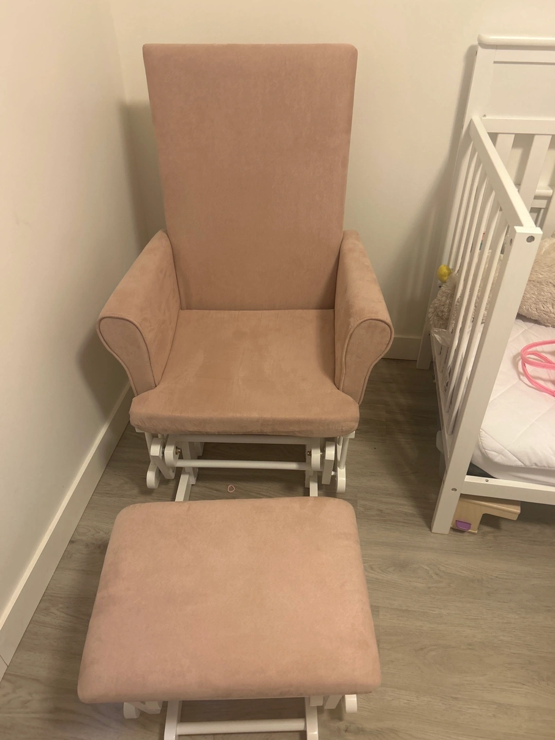 Glider and ottoman set. Pink fabric and white frame. I have never really used it. In excellent condition, no chips or stain.