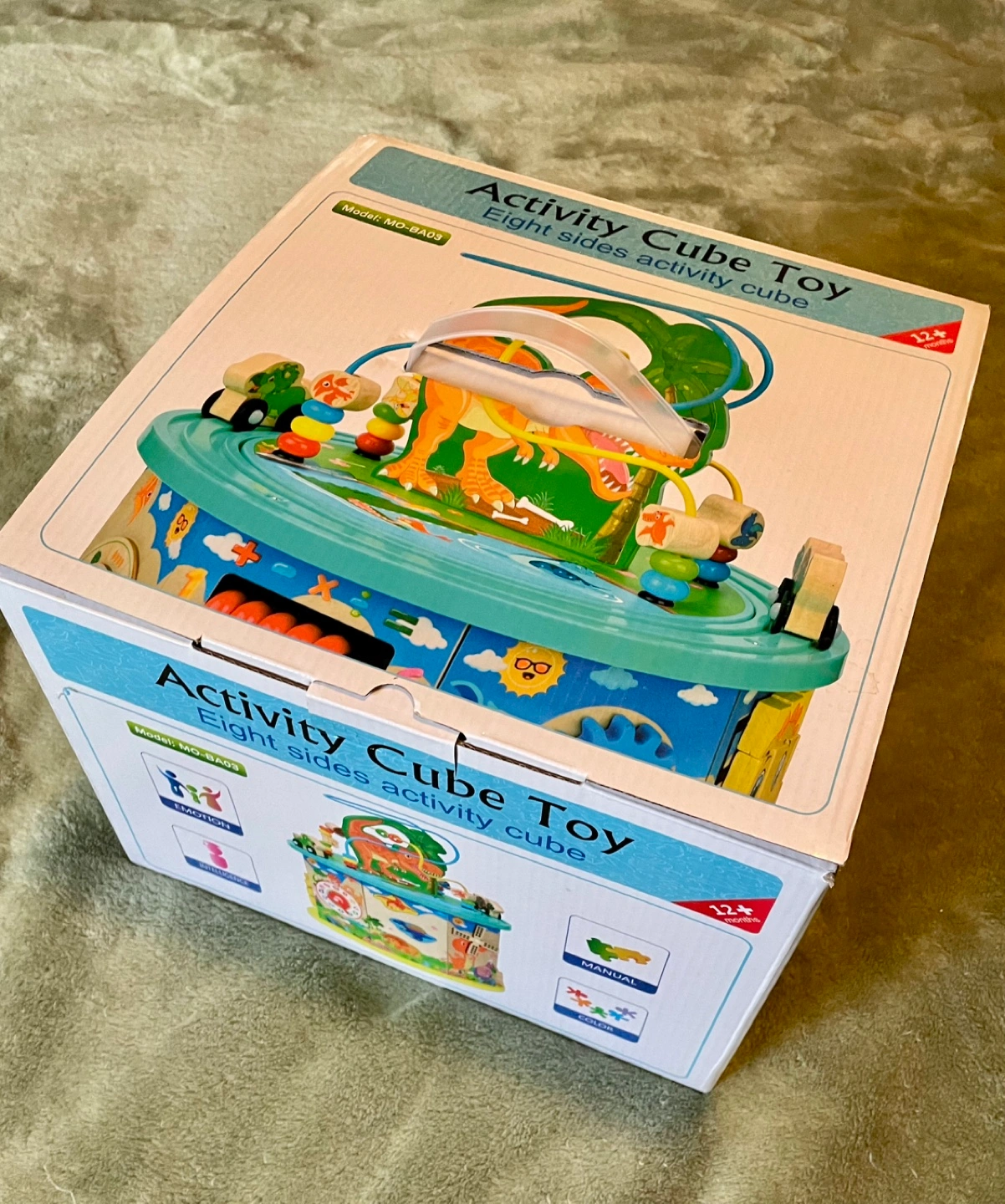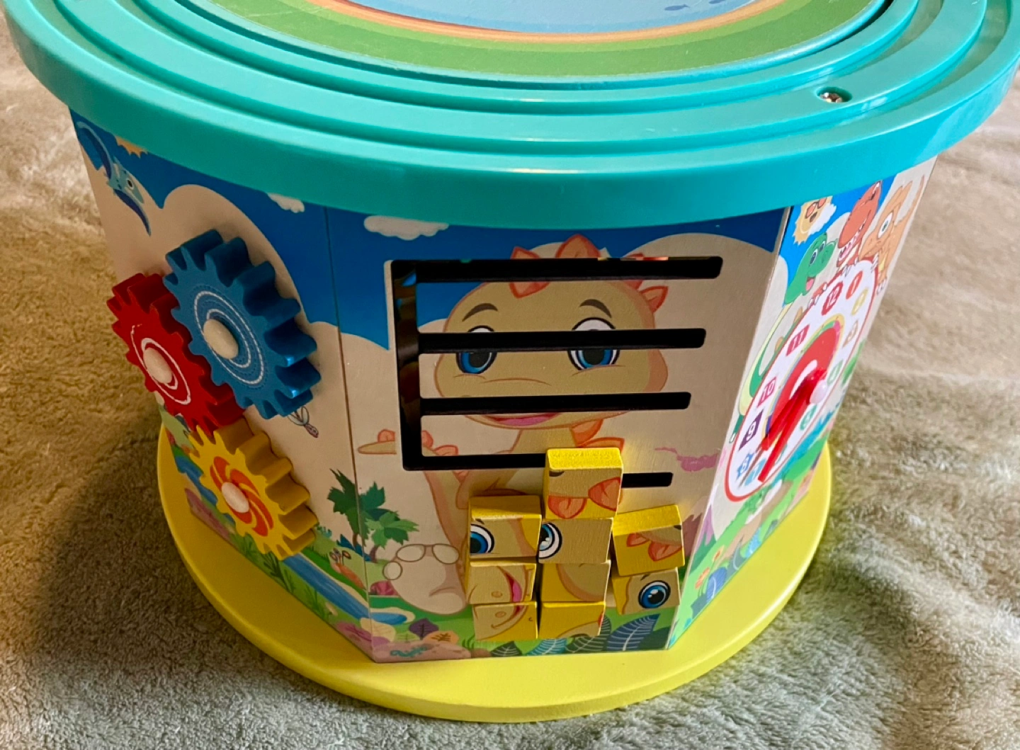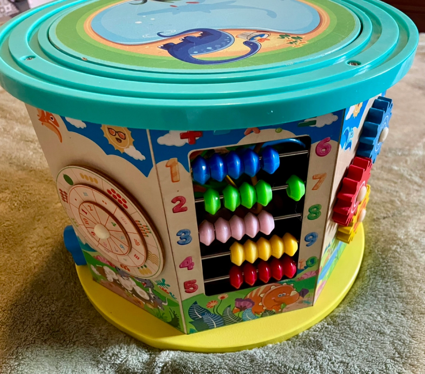 Activity Cube with multiple activities including a bead maze, abacus, clock, gears, shape sorter, and a fishing game. Includes all pieces shown in the pictures. Some wear and tear as pictured.