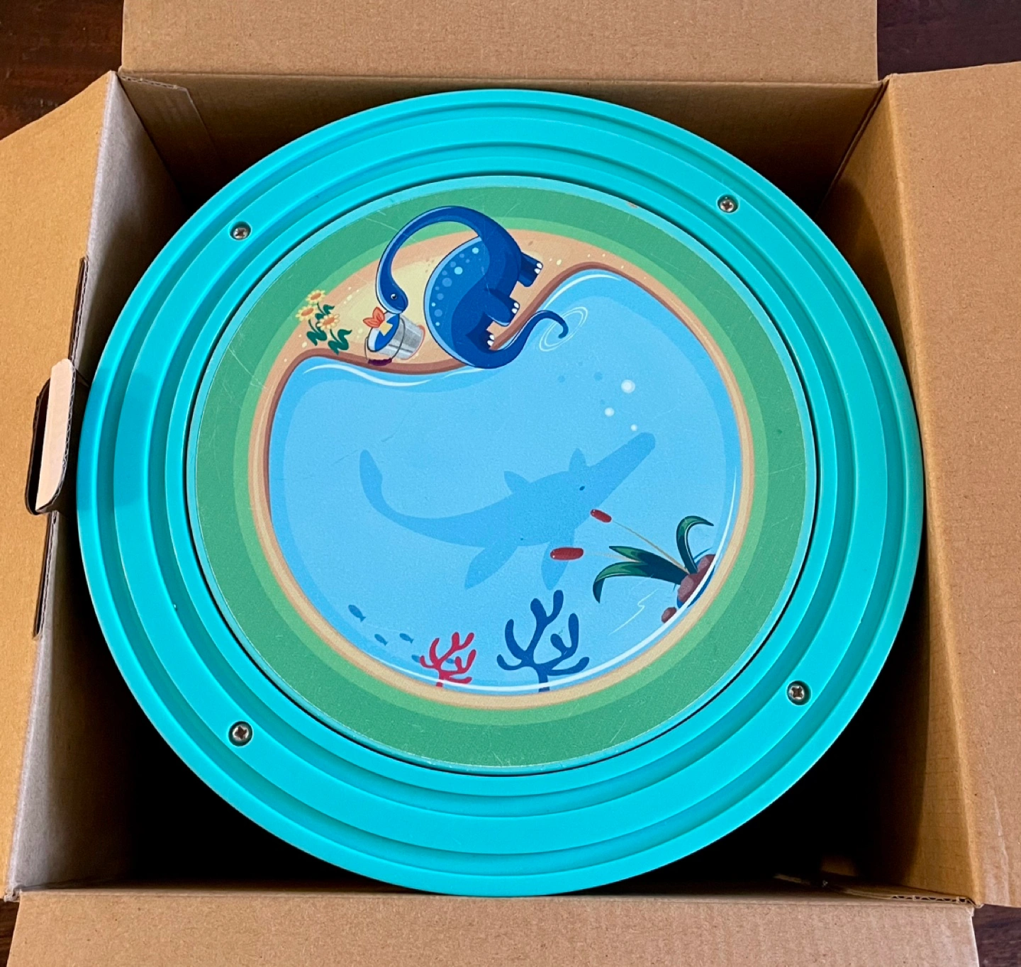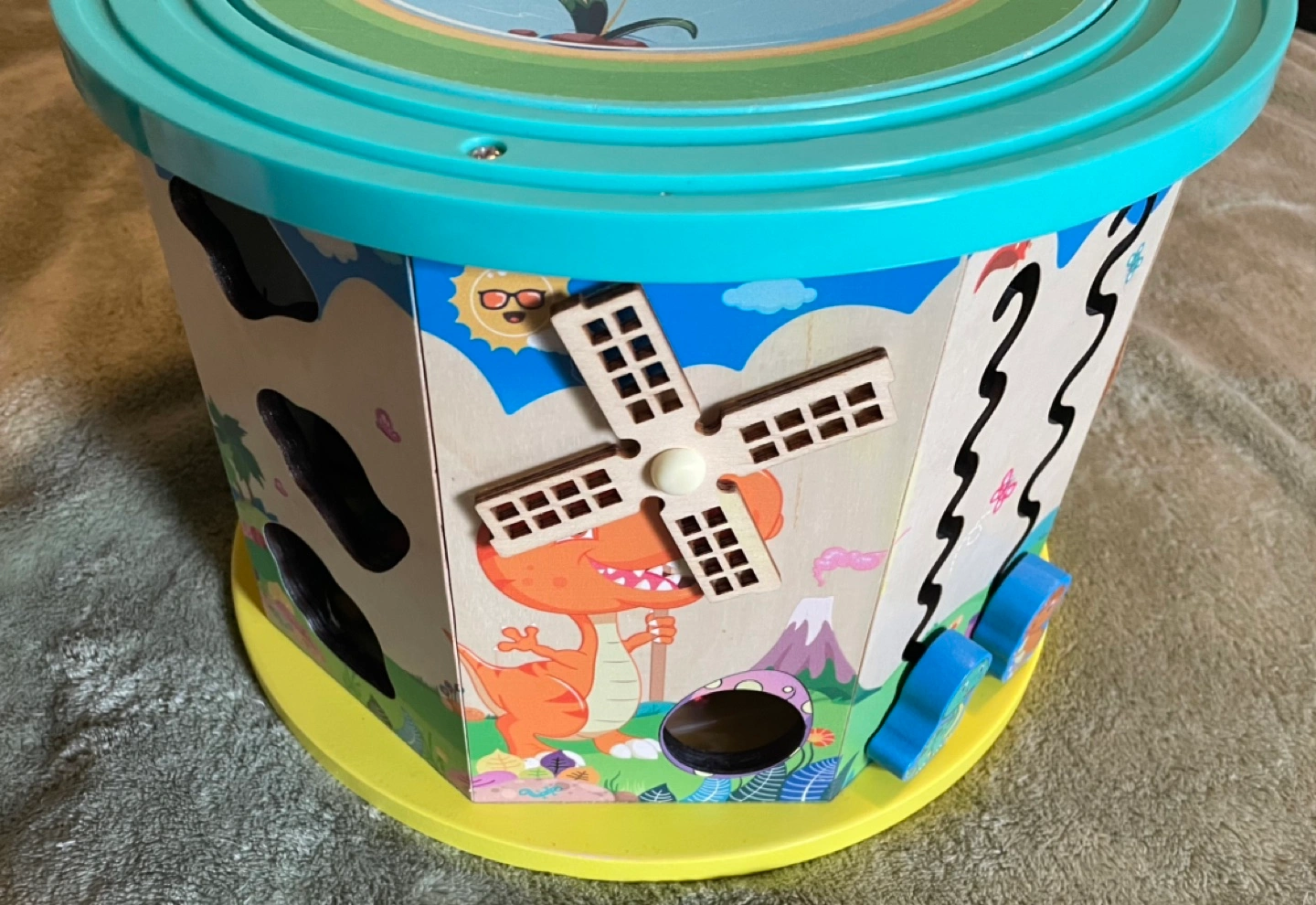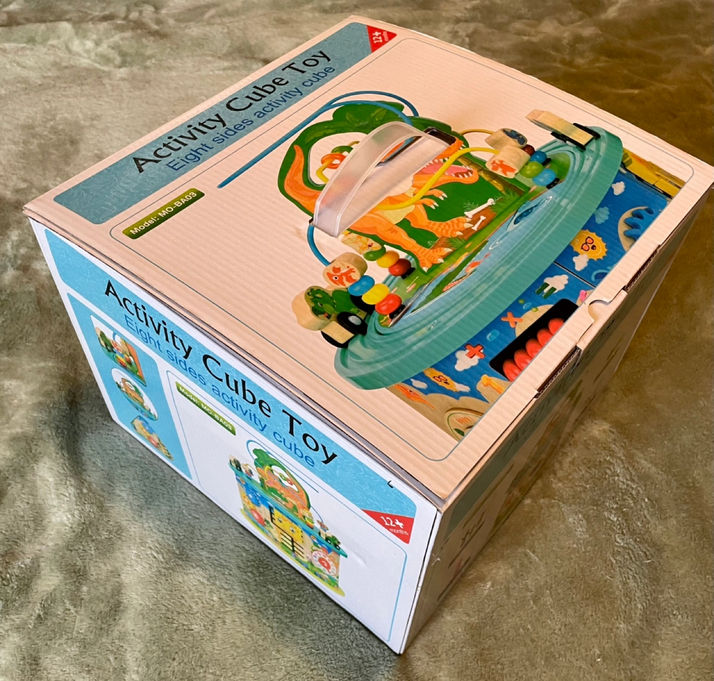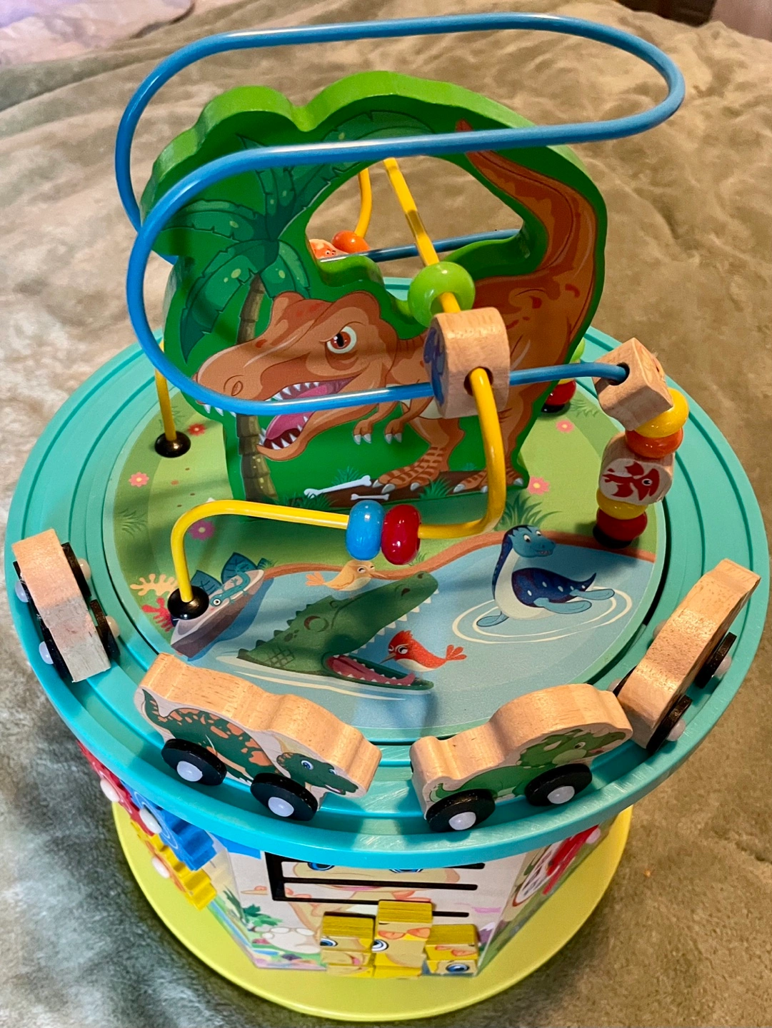 Activity Cube with multiple activities including a bead maze, abacus, clock, gears, shape sorter, and a fishing game. Includes all pieces shown in the pictures. Some wear and tear as pictured.