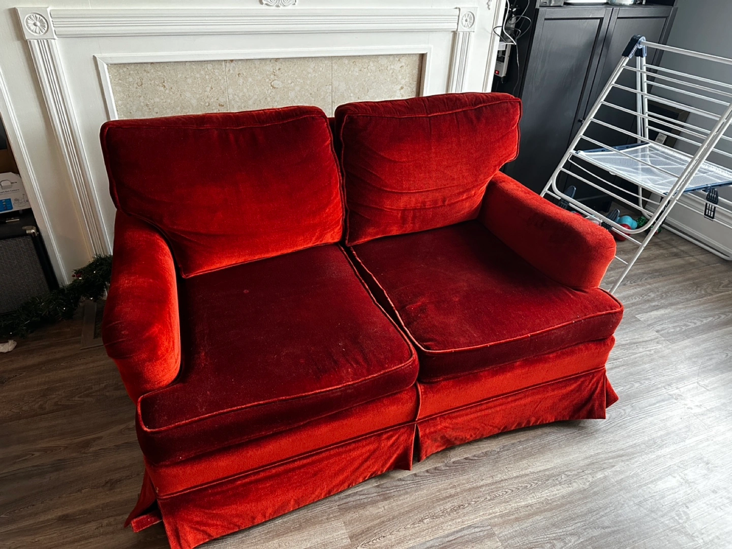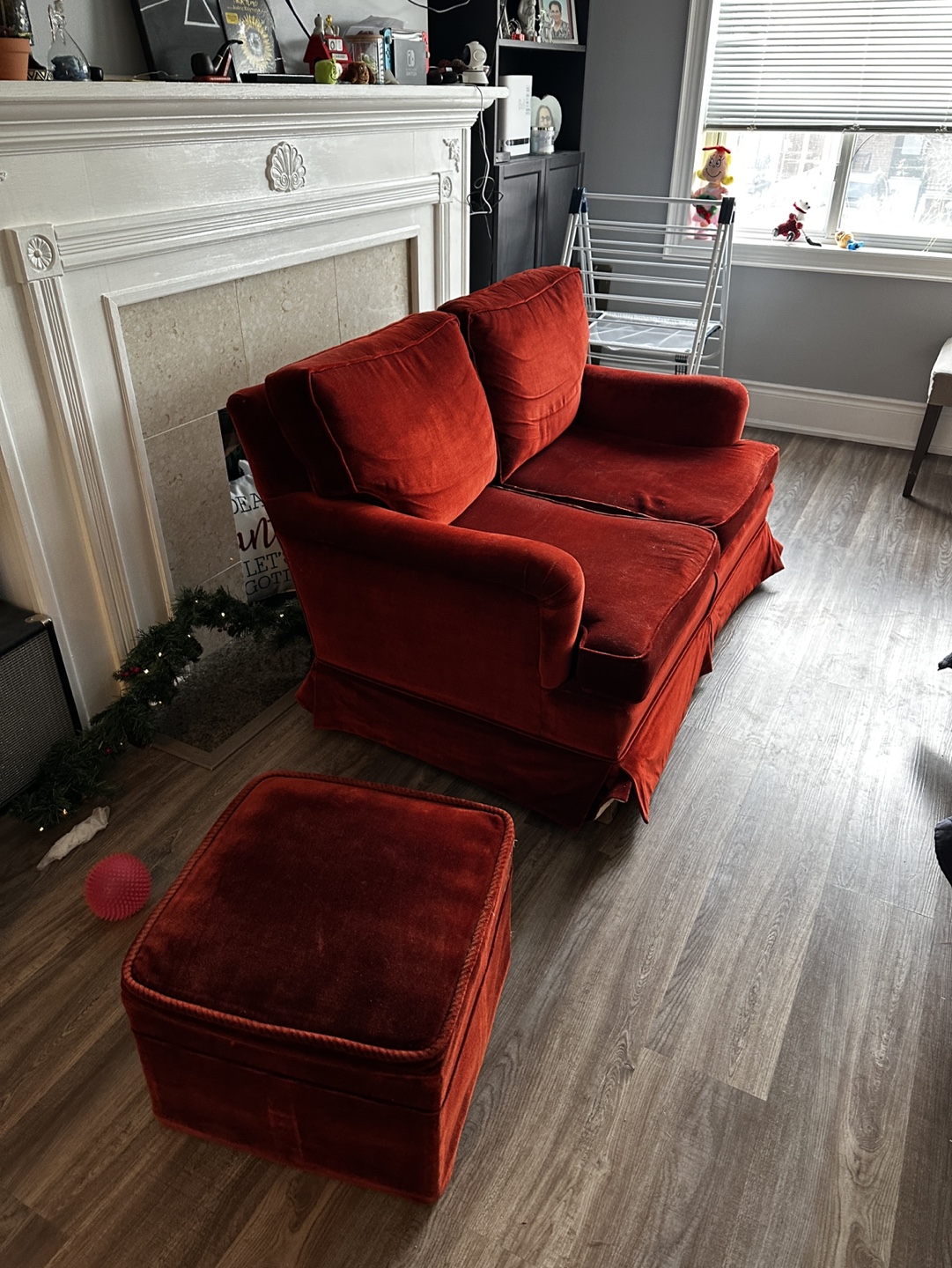 A cozy red velvet loveseat and matching ottoman, perfect for small spaces.