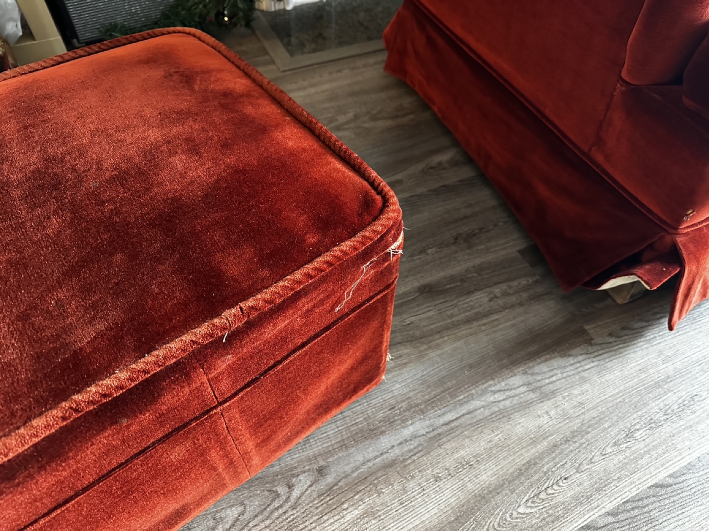The fabric is a luxurious deep red velvet, which adds warmth and elegance to any room. Both pieces have been thoroughly cleaned and sanitized for your peace of mind. They’ve been lovingly cared for and kept indoors only—never exposed to outdoor elements.