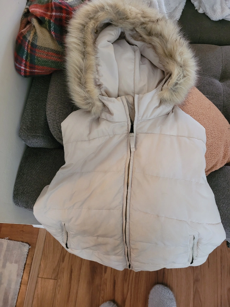 170Cream puffer vest with a faux fur hood. Zipper closure. Two zippered pockets on the sides. Down filled, very warm.