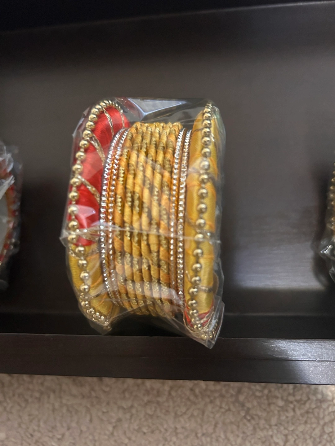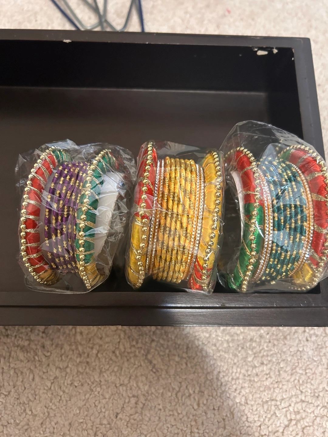 Set of three silk thread bangles in red, green and gold. Each set includes 10-12 bangles.