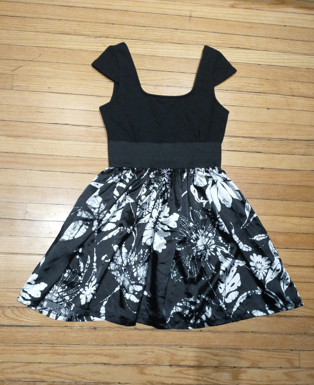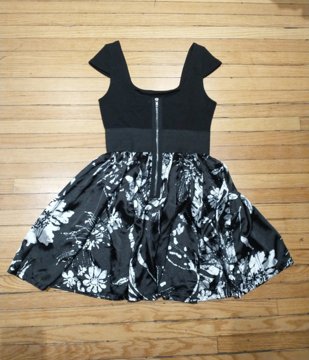 Black and white flora design mini dress Stretchy material, fits about a 26" waist Wide scoop neck design Smoke free home Cash payment, open to trades