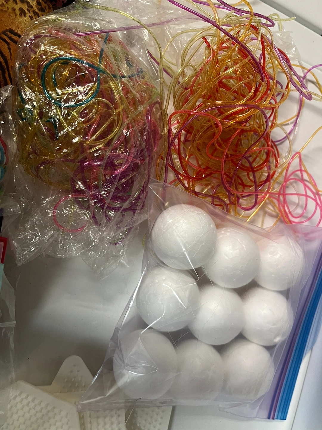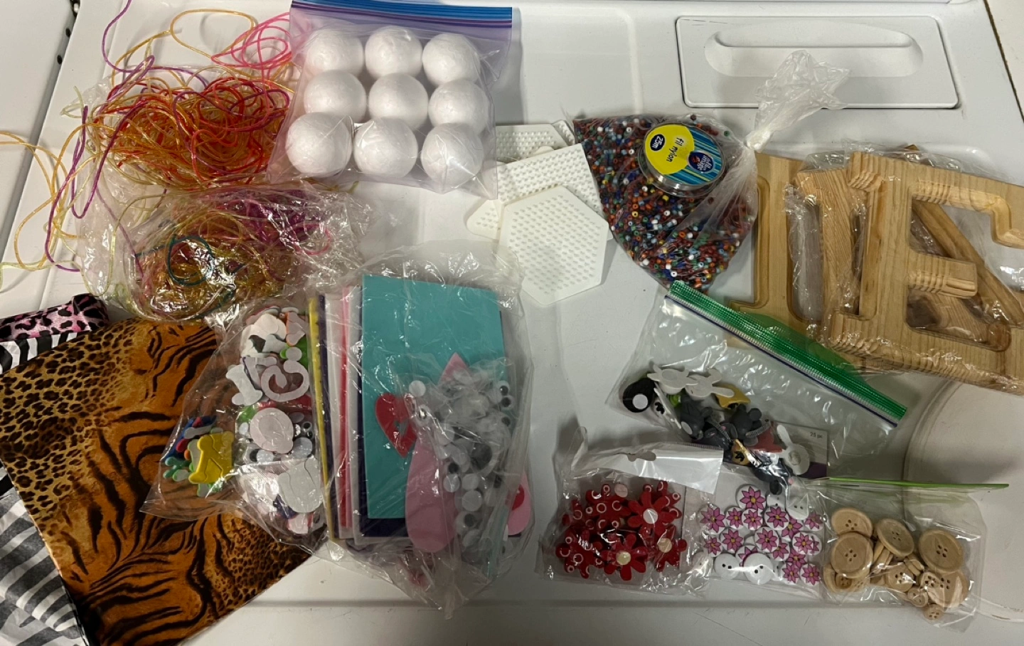 Large lot of craft supplies, including beads, buttons, styrofoam balls, plastic string, wooden letters, glass stones, animal print tissue and more. Perfect for a variety of crafts and projects.