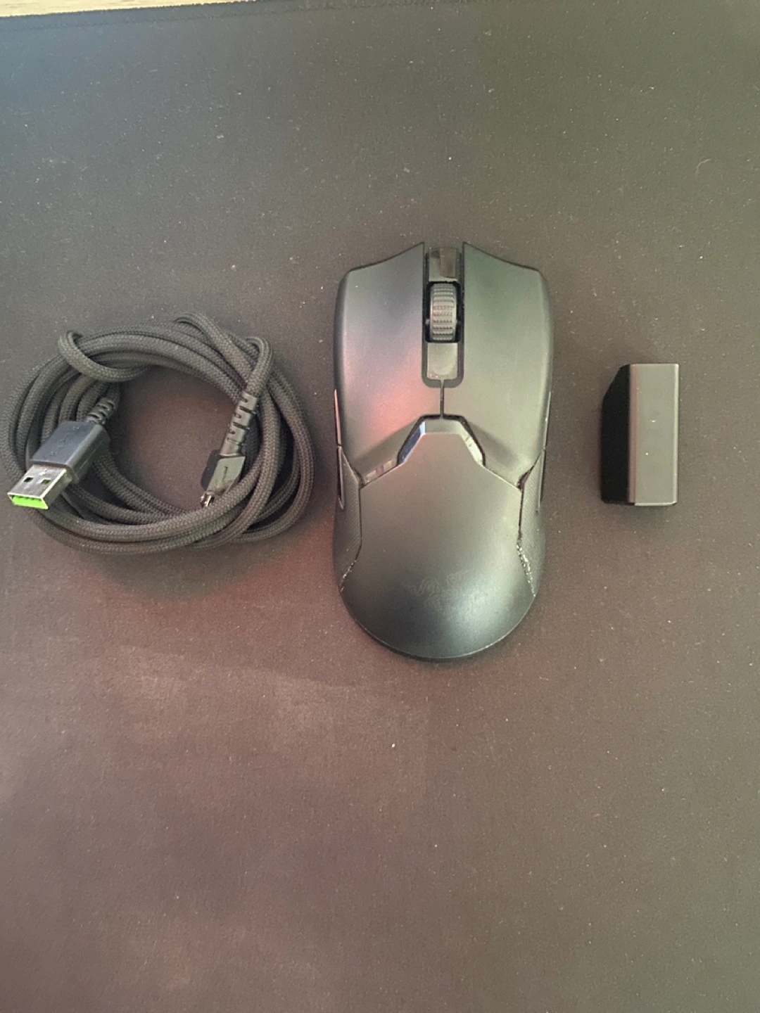 41Razer Viper Ultimate wireless gaming mouse. Includes mouse, charging cable, and USB receiver. Easily accessible software with RGB.