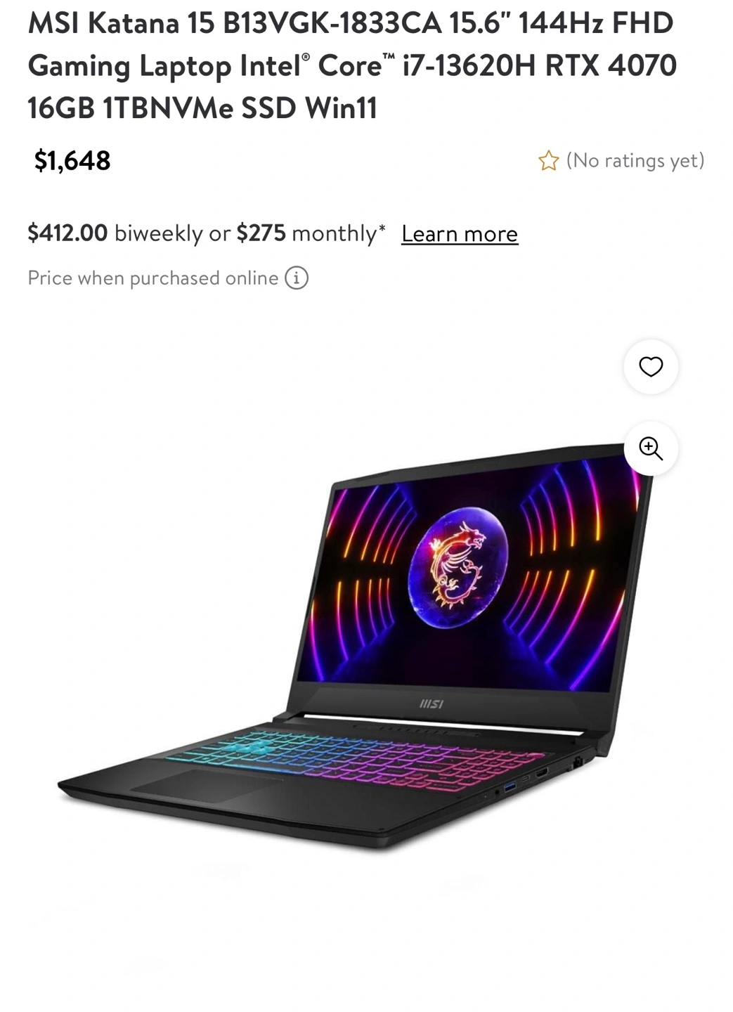 15.6 inch laptop with 144Hz FHD display. Comes with Intel Core i7-13620H processor, RTX 4070 graphics card, 16GB RAM and 1TB NVMe SSD. Windows 11 pre-installed.