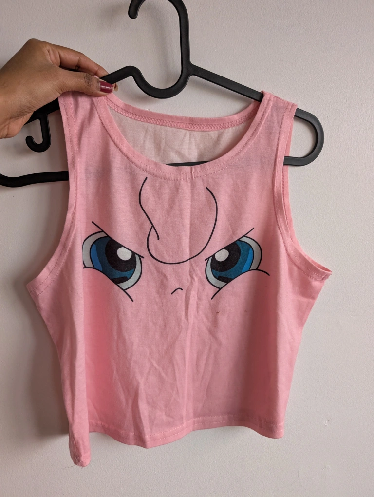 Pink crop top with a Jigglypuff design. Sleeveless. I just don't wear it anymore and grew out of the pokemon craze.