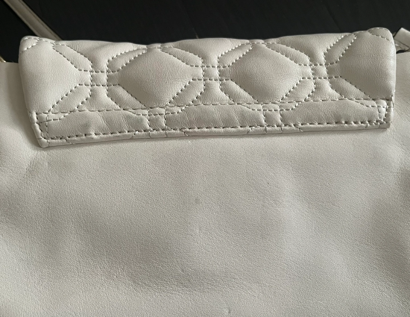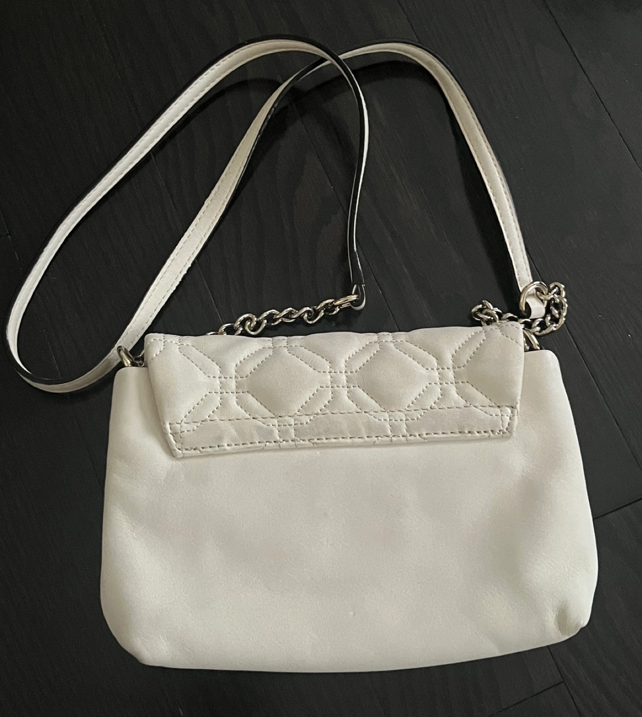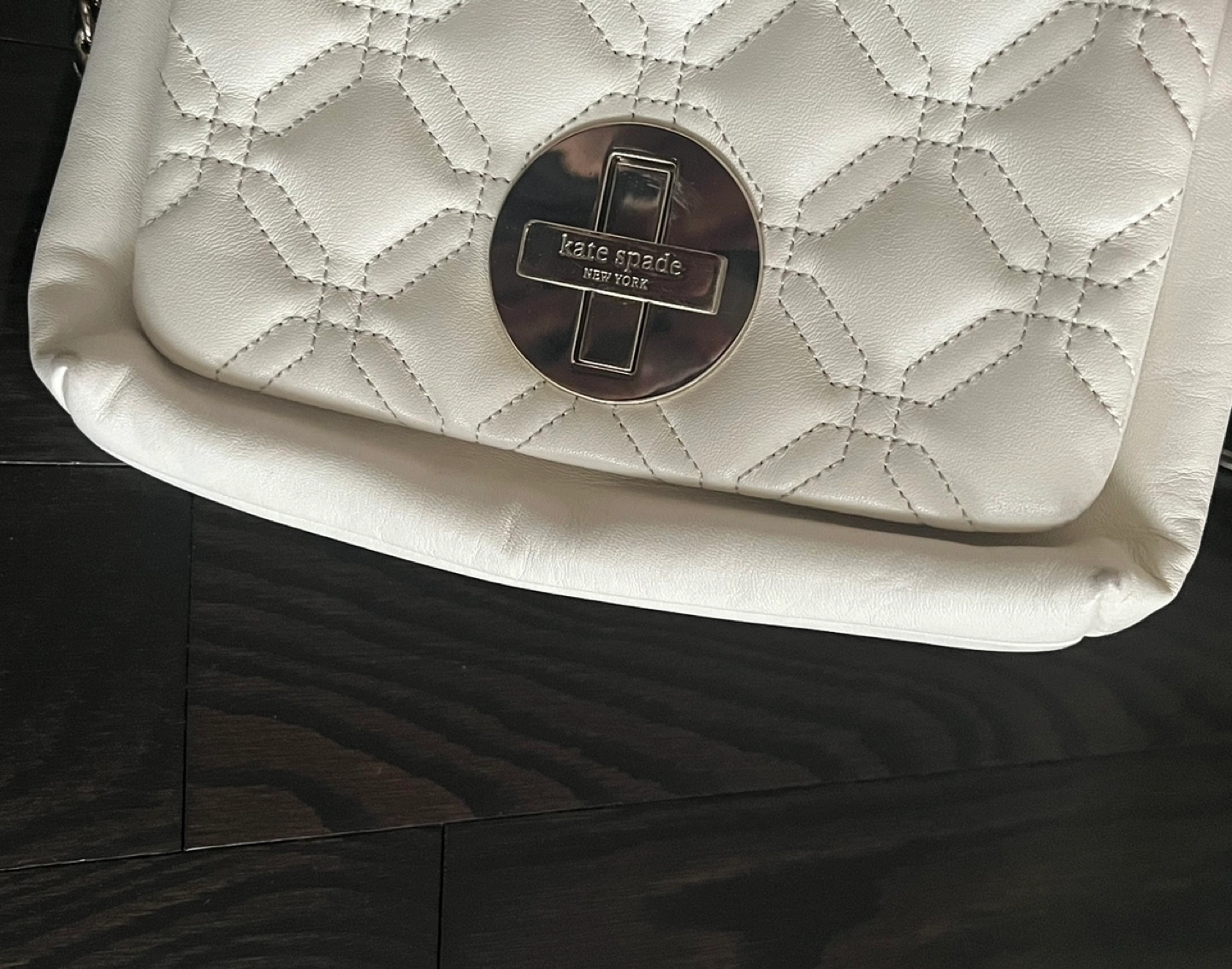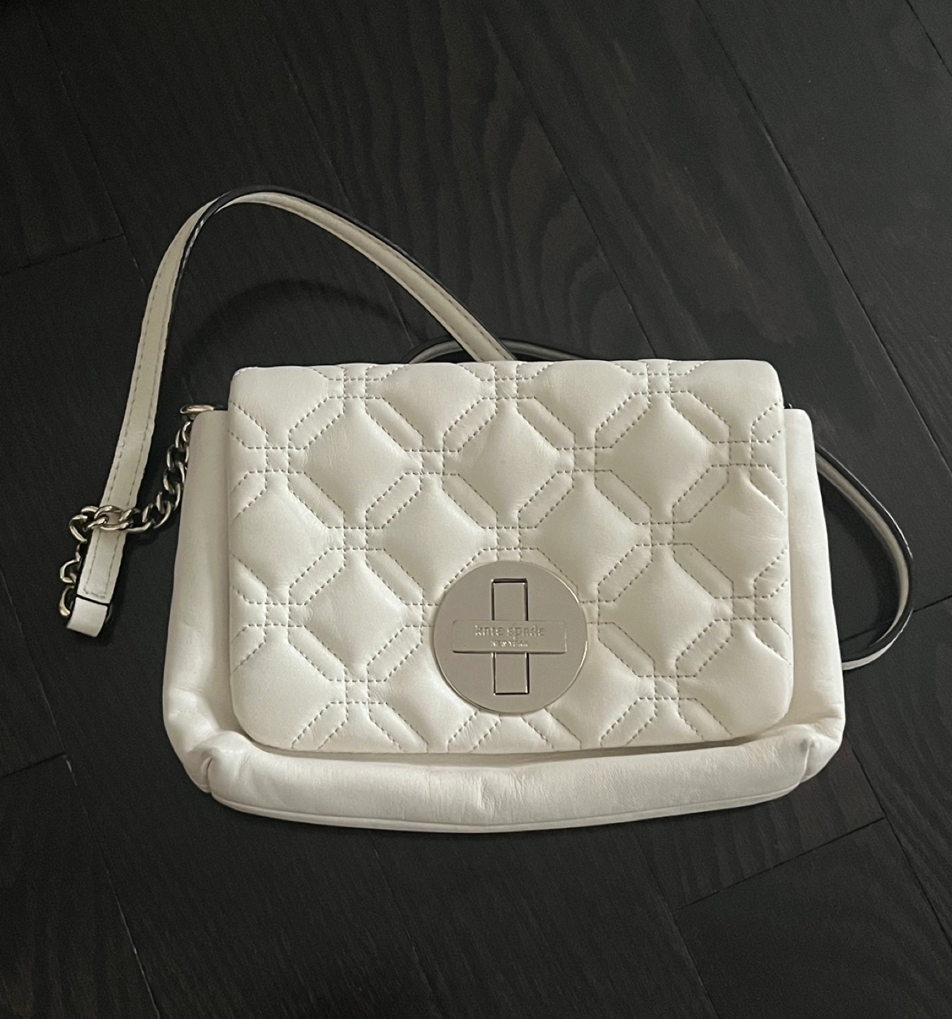 Ivory white quilted crossbody bag. Features a silver chain strap and a silver Kate Spade logo on the front flap.
