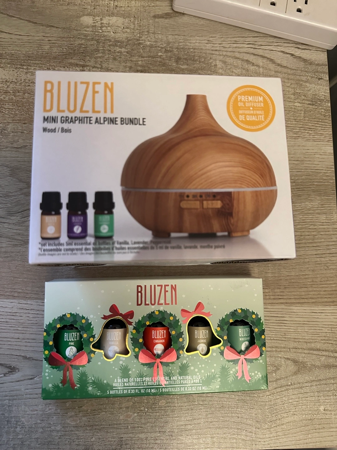 Includes a wood finish oil diffuser and 5 bottles of essential oils.
