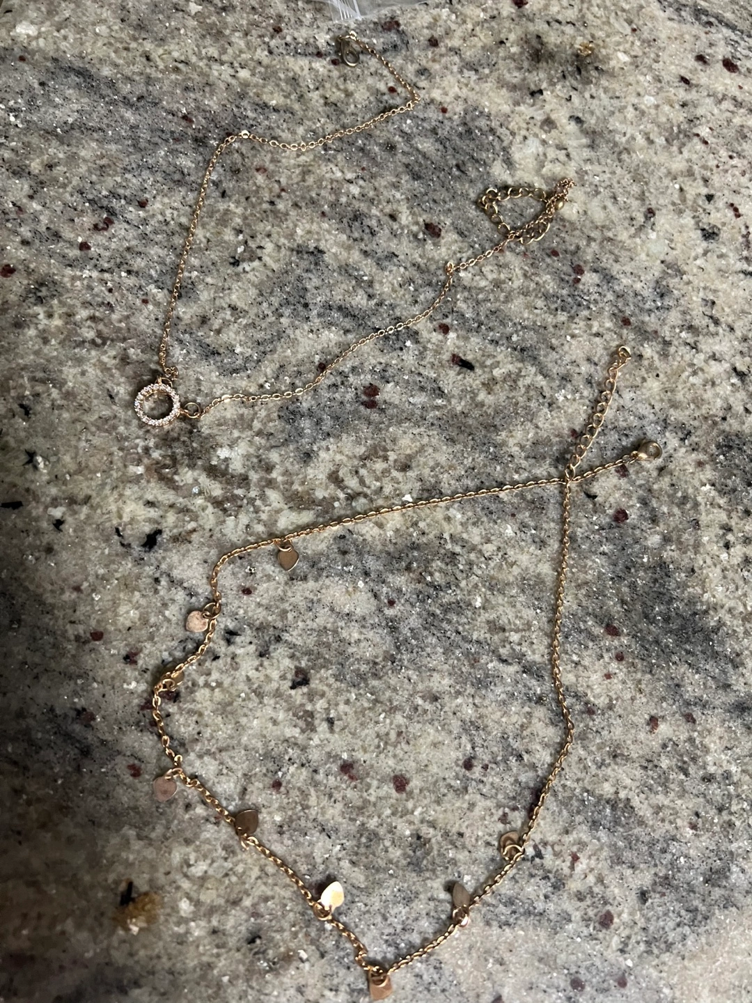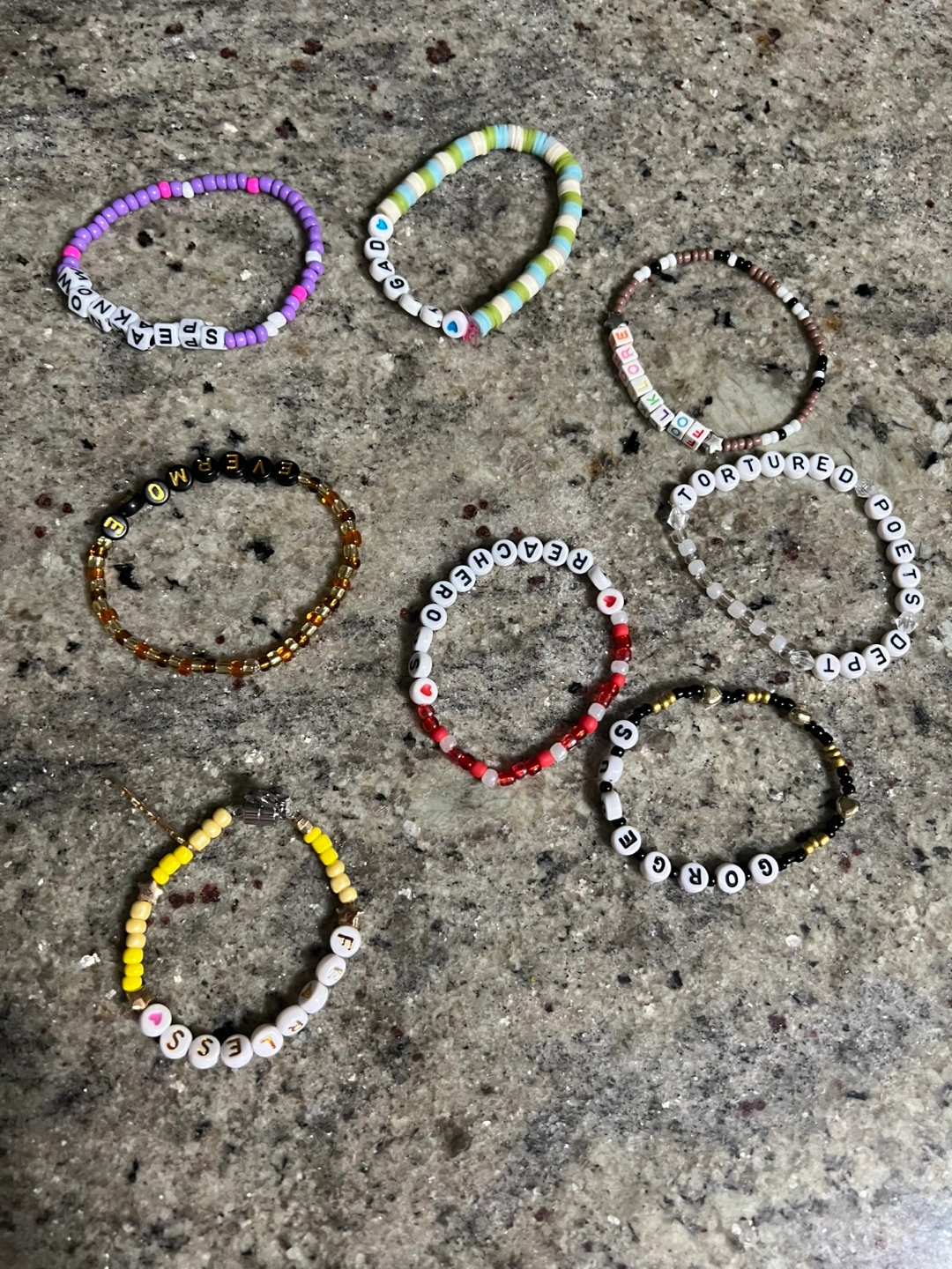 Set of seven beaded bracelets Taylor S. with different words, and two gold necklaces. One necklace is a simple chain with a circle pendant, and the other has a chain with several small heart pendants.
