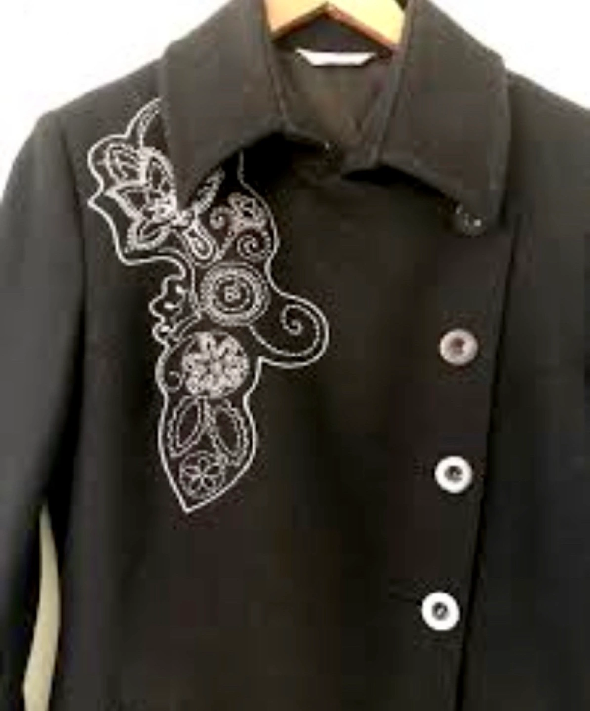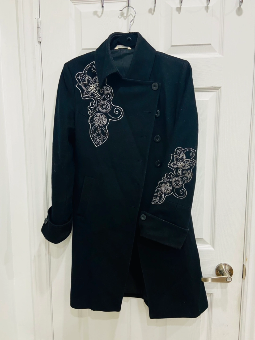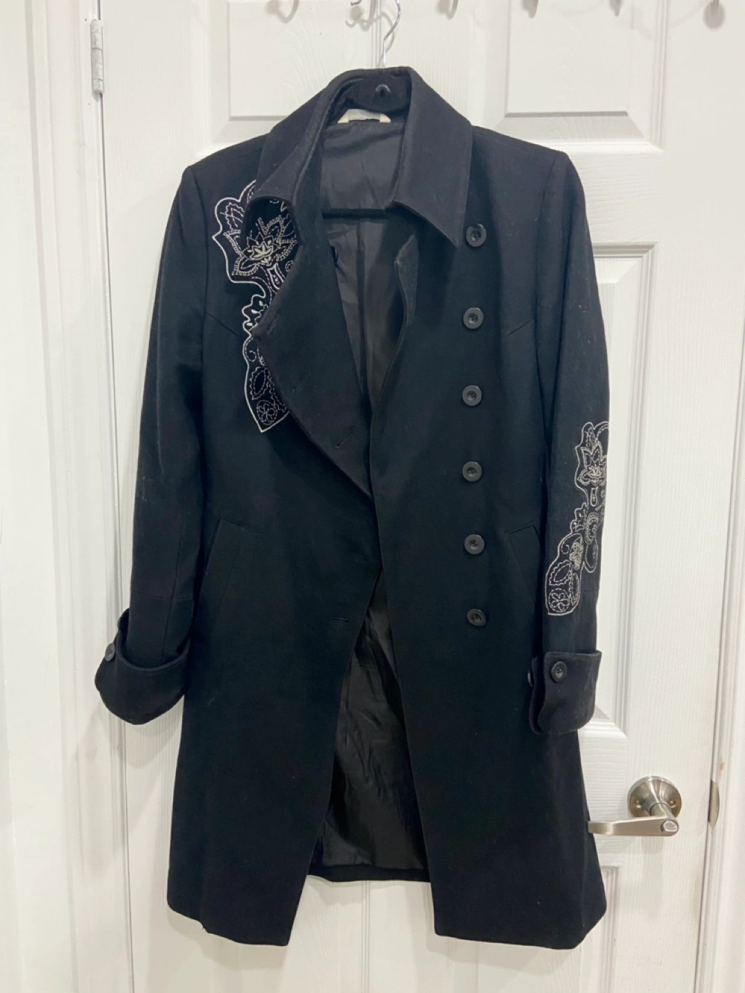 Black fall/winter coat with white embroidery, long sleeves, double breasted.