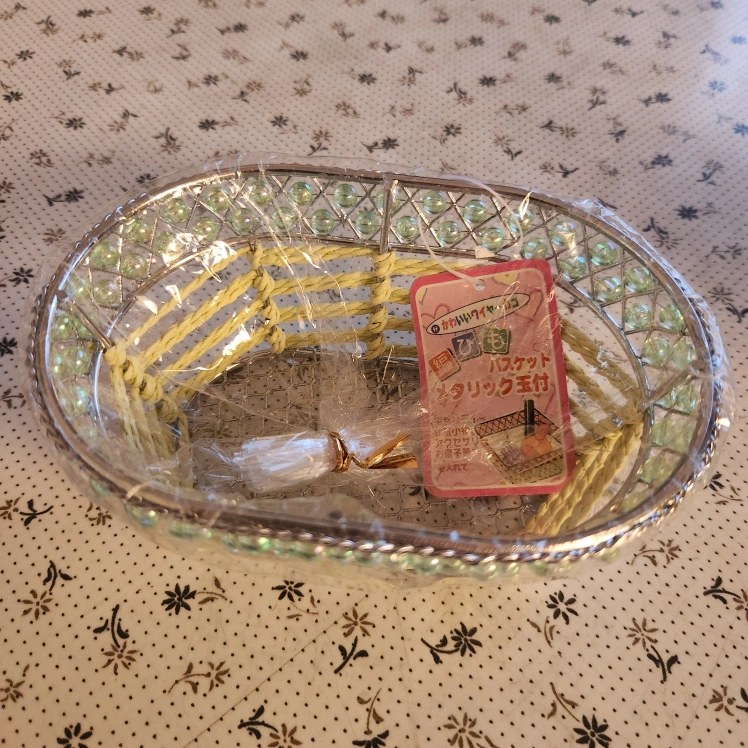 269Brand New Small oval wire basket with green beads around the rim and yellow rope-like design on the sides.