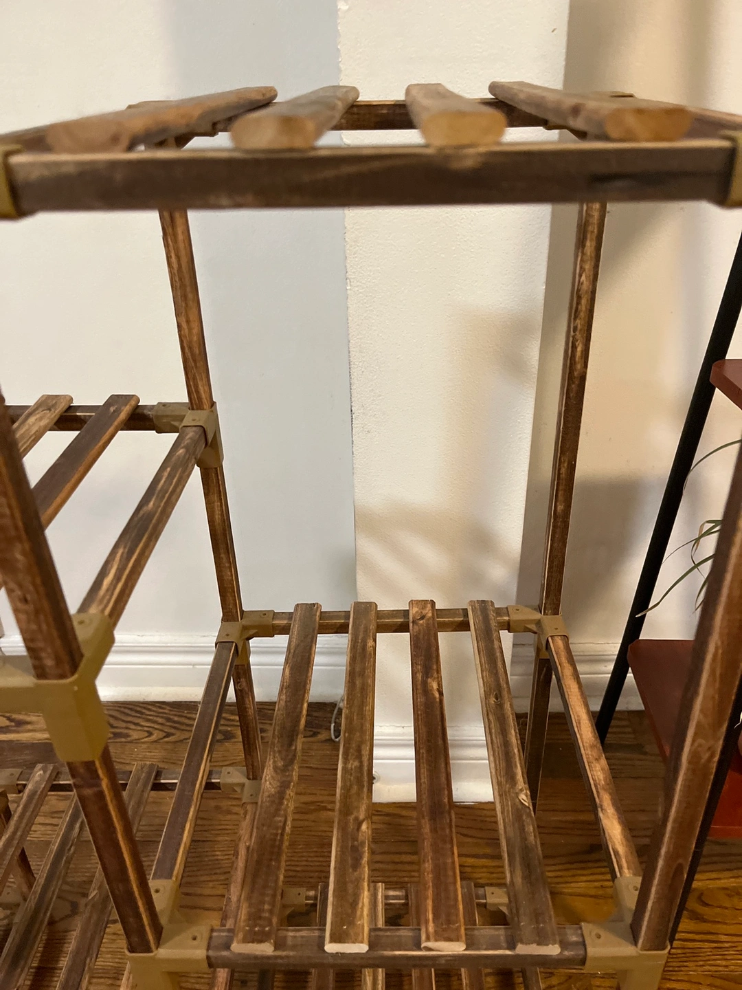 Four-tier shelf unit. Made of wood with plastic connectors. Suitable for storing shoes, plants, or other items. It’s in great condition bought an year back . We used for simple plant decor.