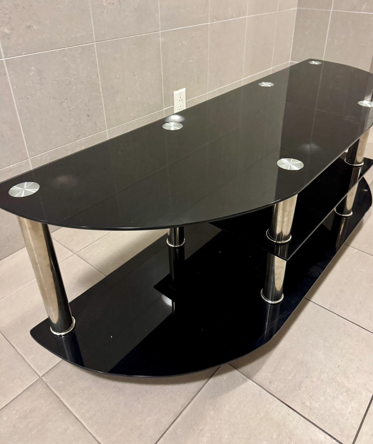 55” Black tempered glass 8mm TV stand with chrome legs, has middle small shelf and large lower shelf.