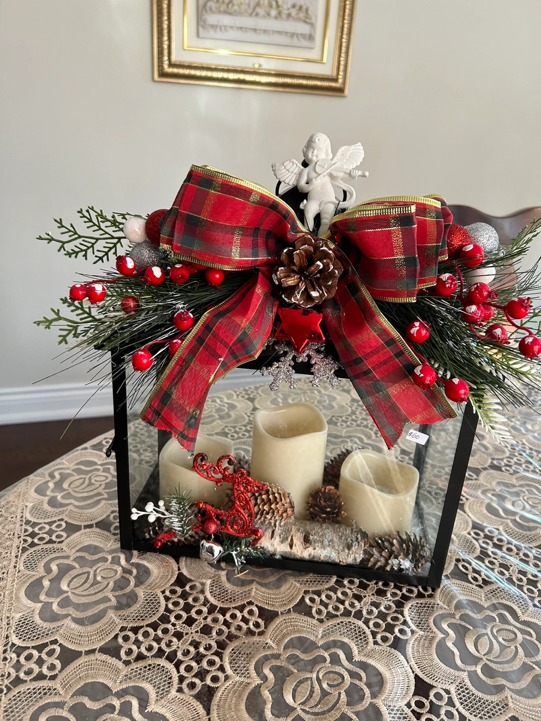 Black metal lantern with a glass front. Decorated with a plaid bow, pine cones, berries, and a Christmas angel. Includes three pillar candles. Perfect for holiday decorating.