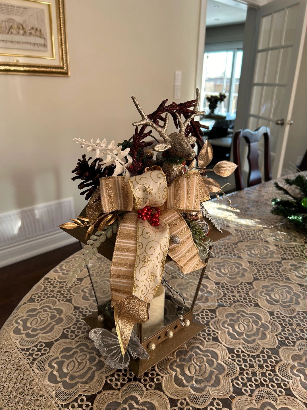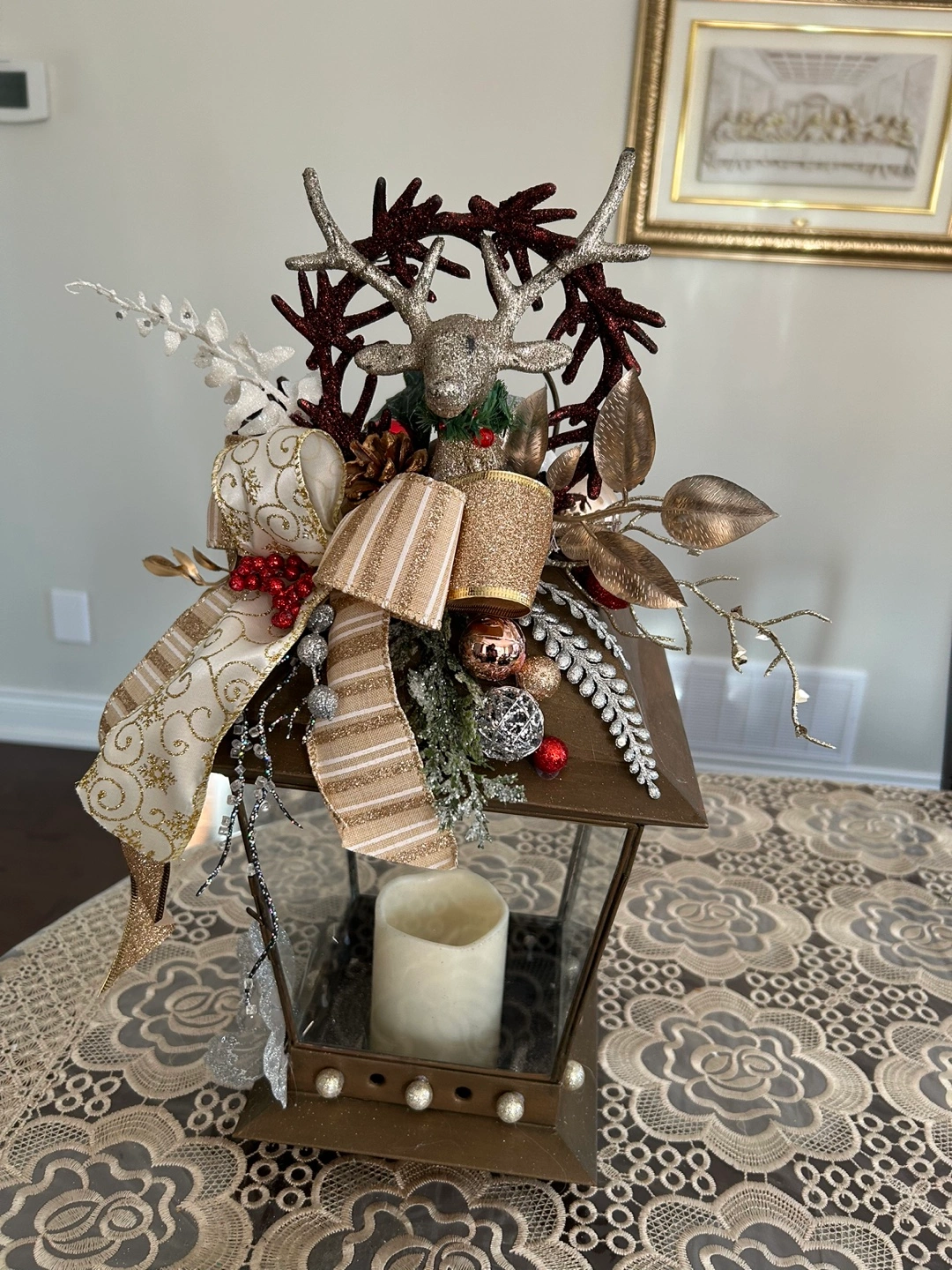 Metal lantern with a candle and Christmas decor, including a deer, pine cones, greenery, ribbon, and ornaments. The candle is battery operated and includes a timer function.