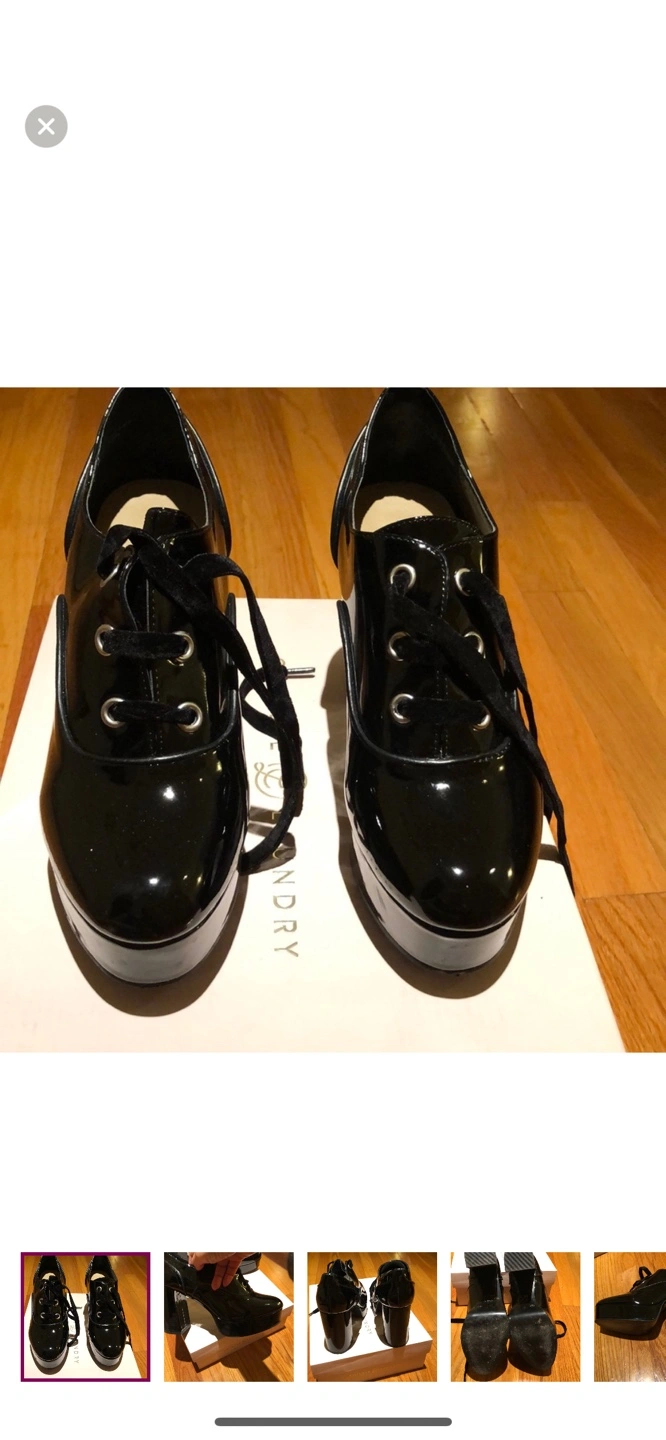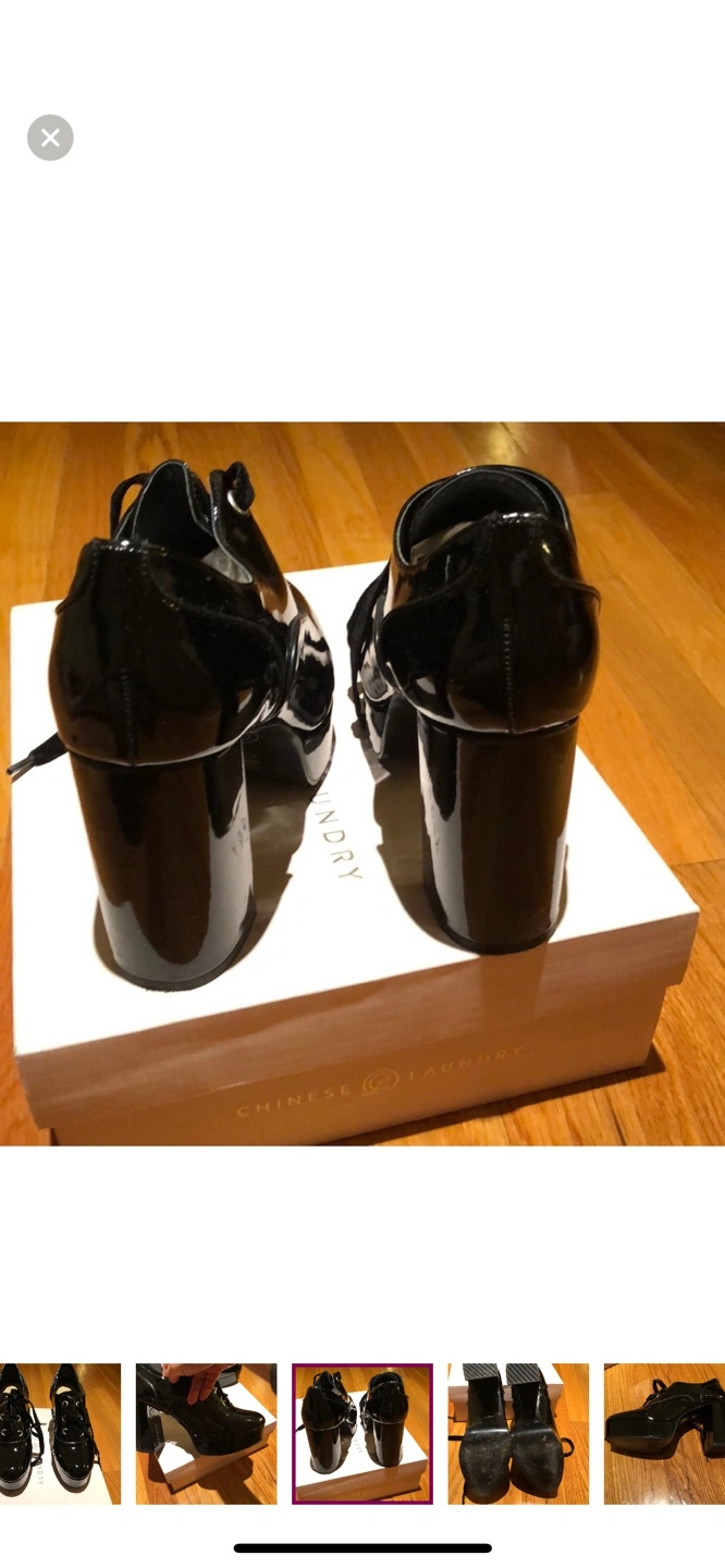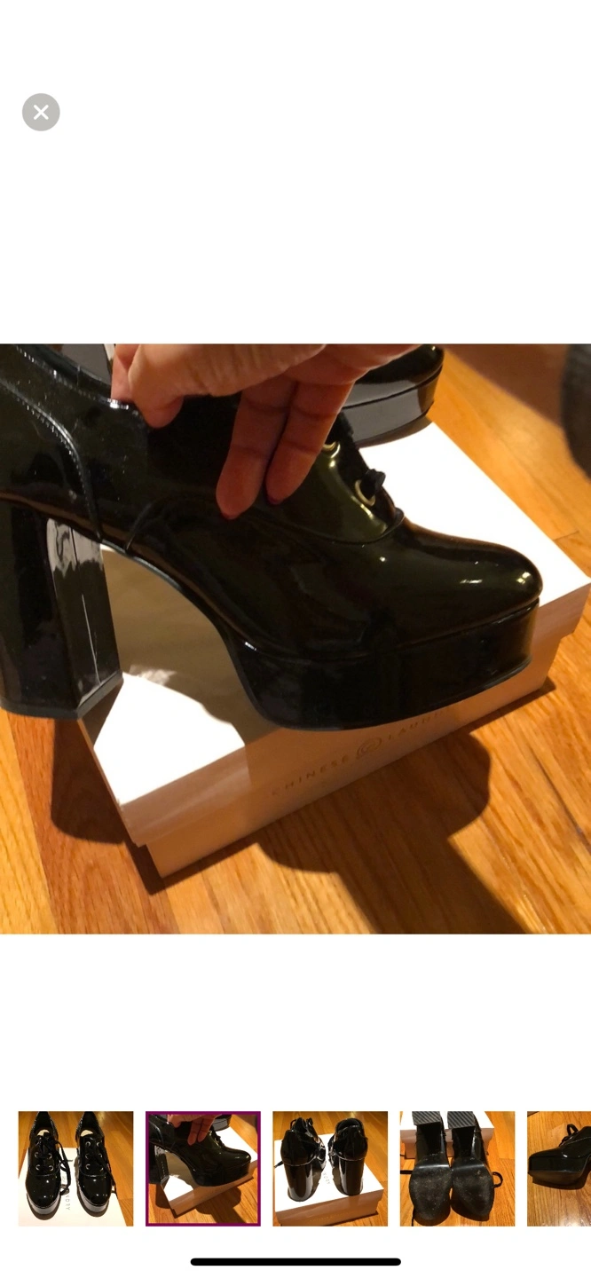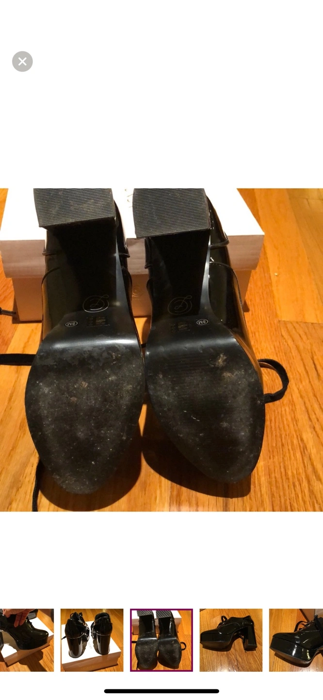 Black patent leather platform heels with lace-up detail. Comes with original box.