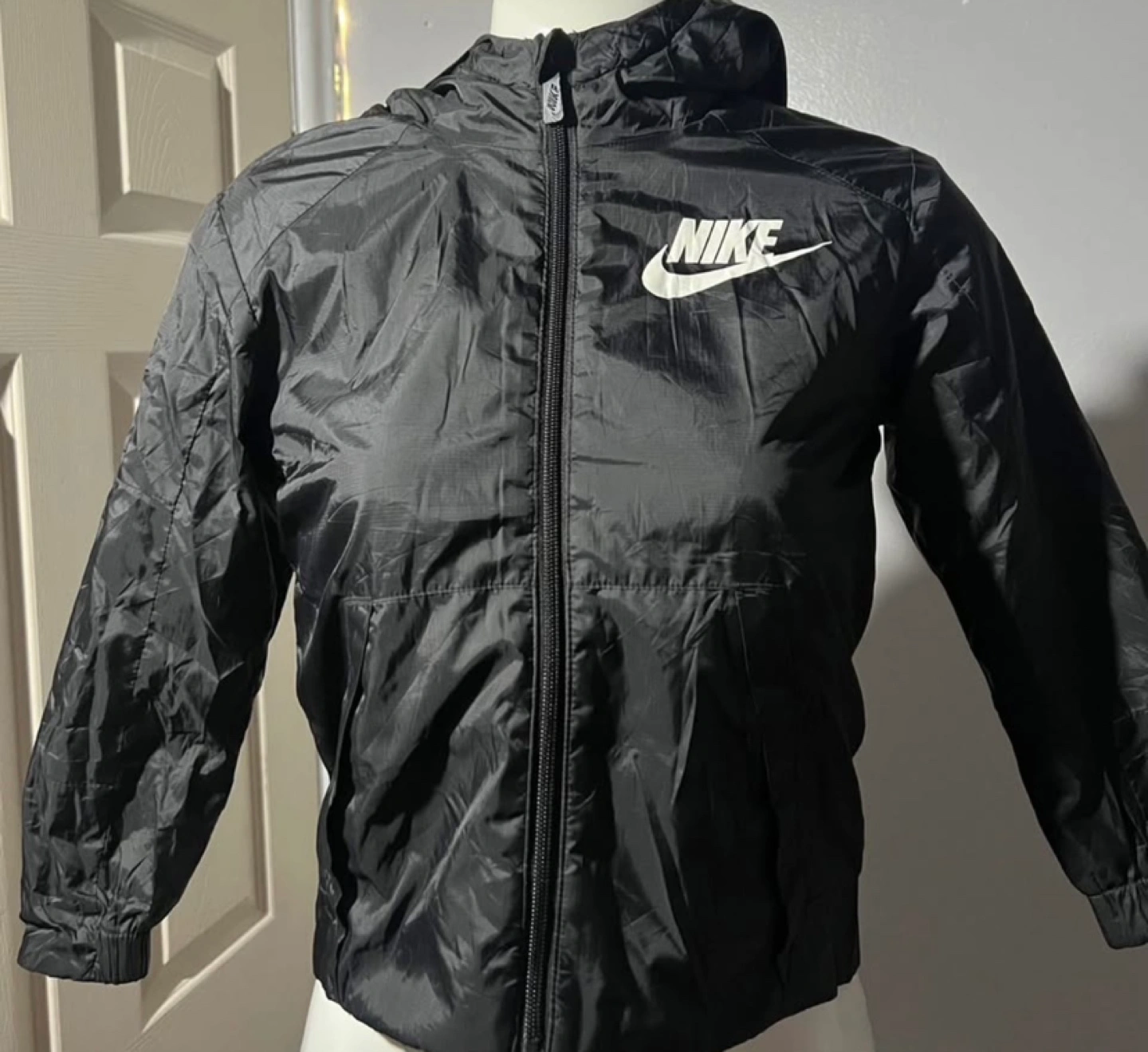 Black windbreaker jacket with a zipper closure and a hood. Has two front pockets. White Nike logo on the left chest.