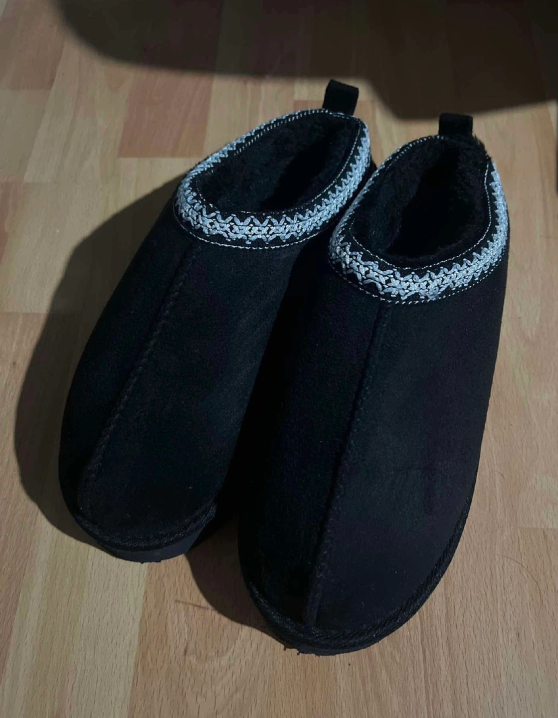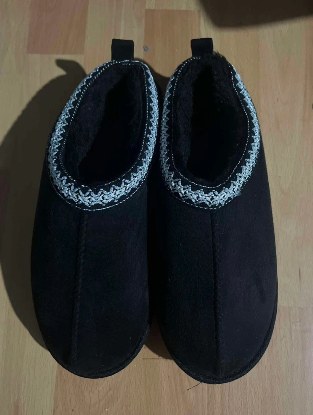 Black fuzzy slippers with a white trim. Very soft and comfortable. Great for keeping your feet warm on cold days.
