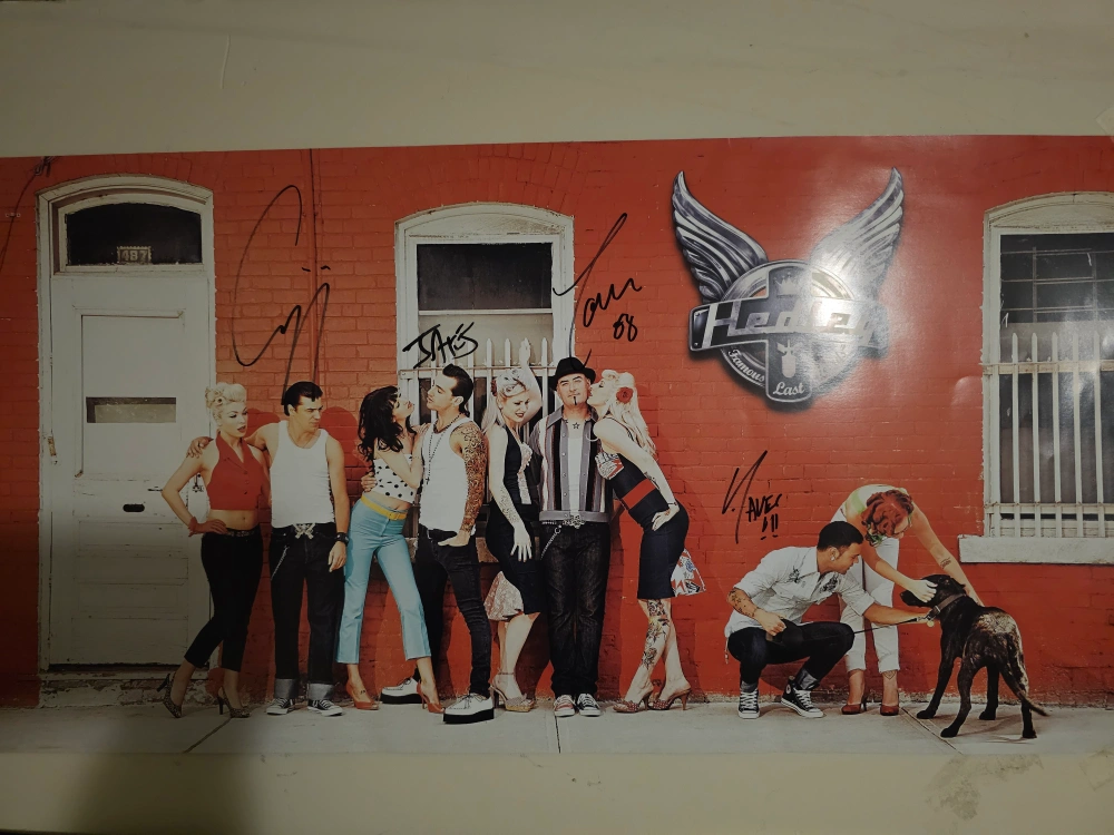 Poster signed (in black sharpie) by all 4 members of the rock band Hedley back in 2008. All 4 corners have tape marks because I put it on a wall when I was a teenager ๐