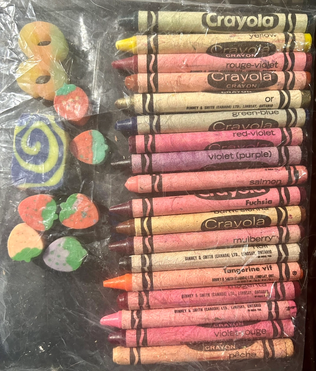 160Set of vintage Crayola crayons in a plastic bag. Includes multiple colours and a few erasers. Moving sale. See my other items. Pick up in Rundle, NE Calgary. If listed it is still available!