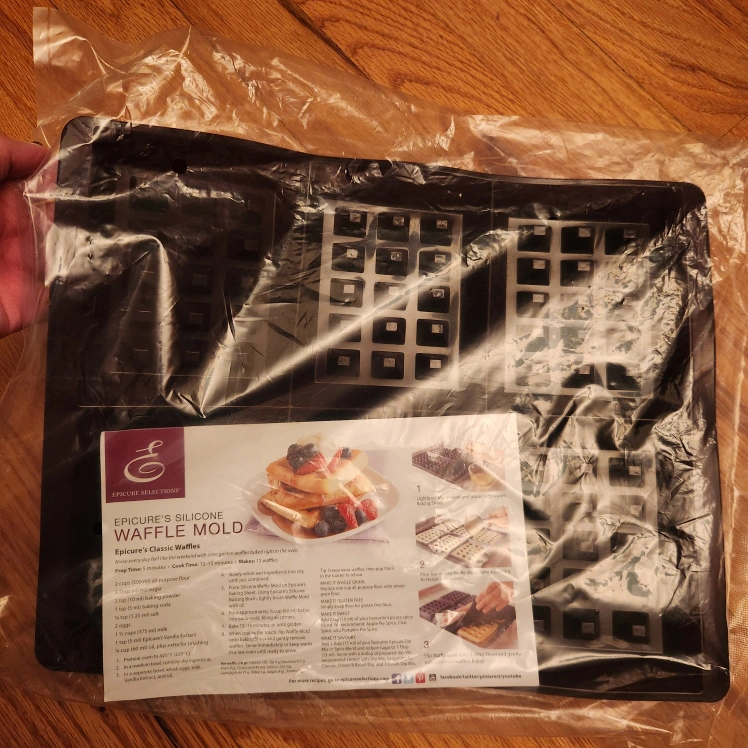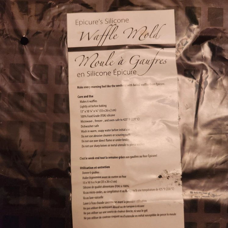 269Epicure waffle silicone mold. Makes 6 waffles. Food grade silicone. Dishwasher, freezer, and microwave safe. Do not use sharp knives or metal utensils to pierce waffles.
