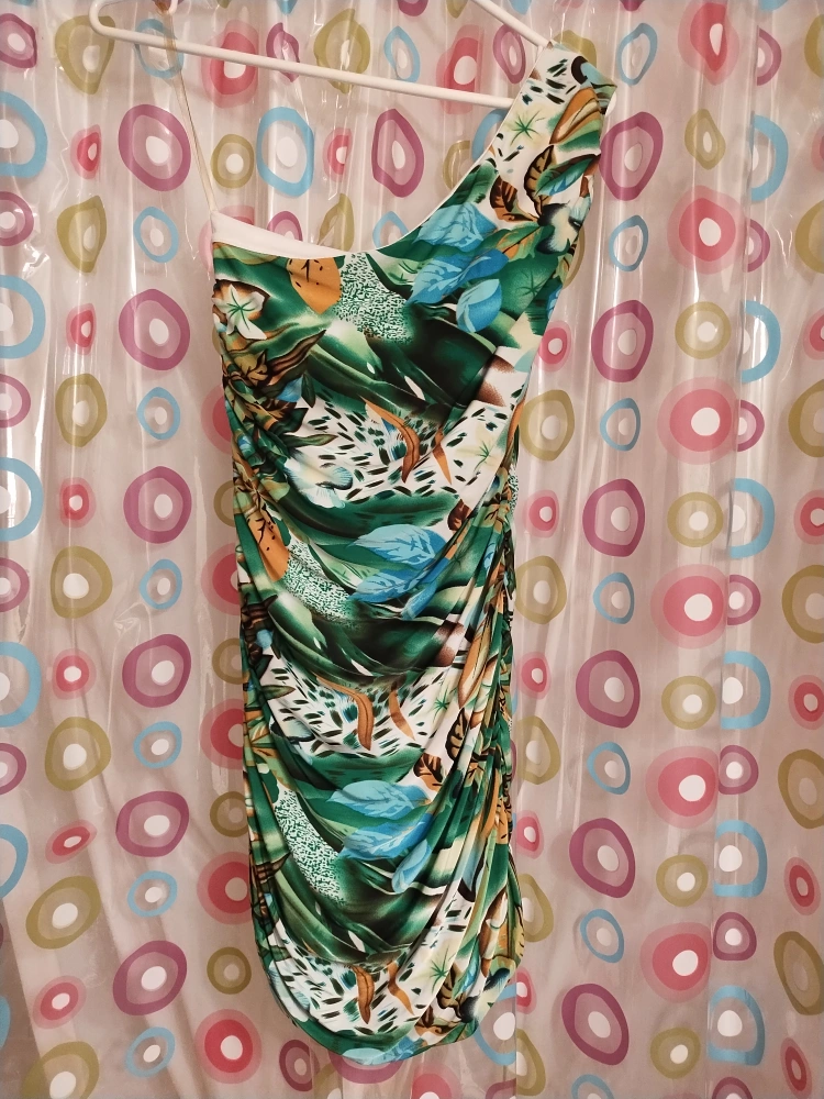 One shoulder short dress with a very colourful tropical print. Zipper closure in the back. Stretchy material and very flattering.