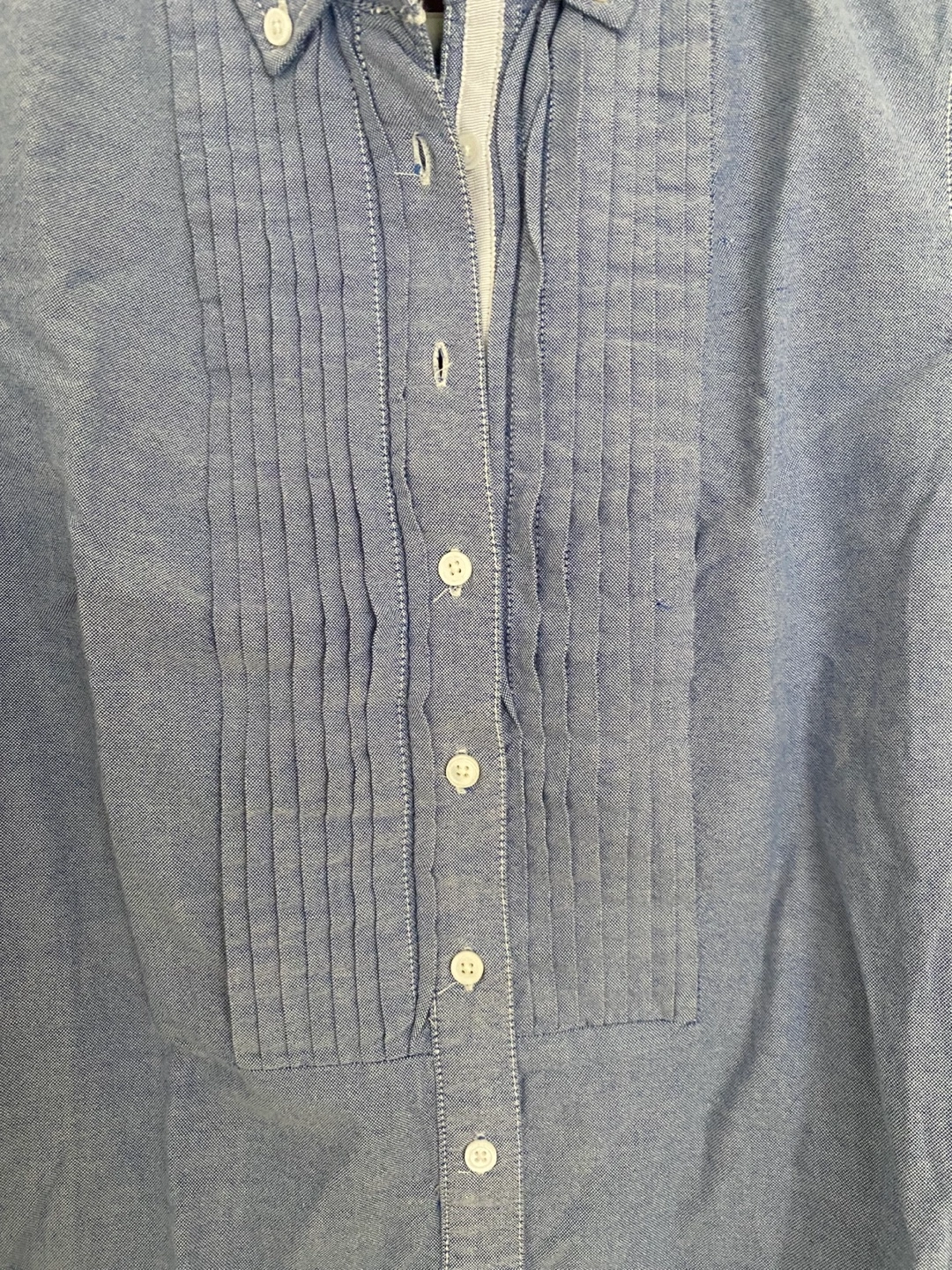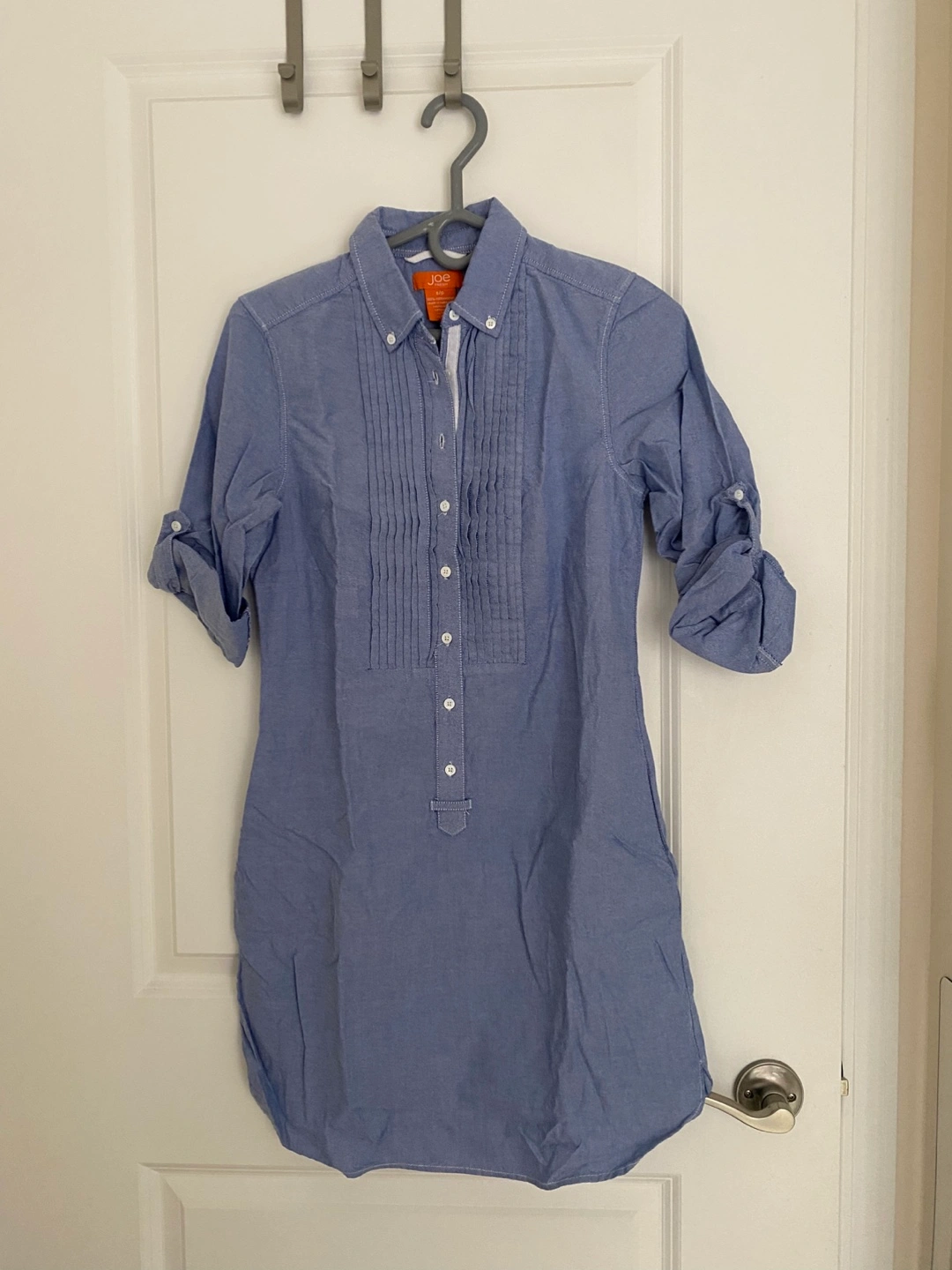 Blue dress with button-up front, pleated detail, roll up sleeves and pockets! Great for vacation or resort wear or just a day out.