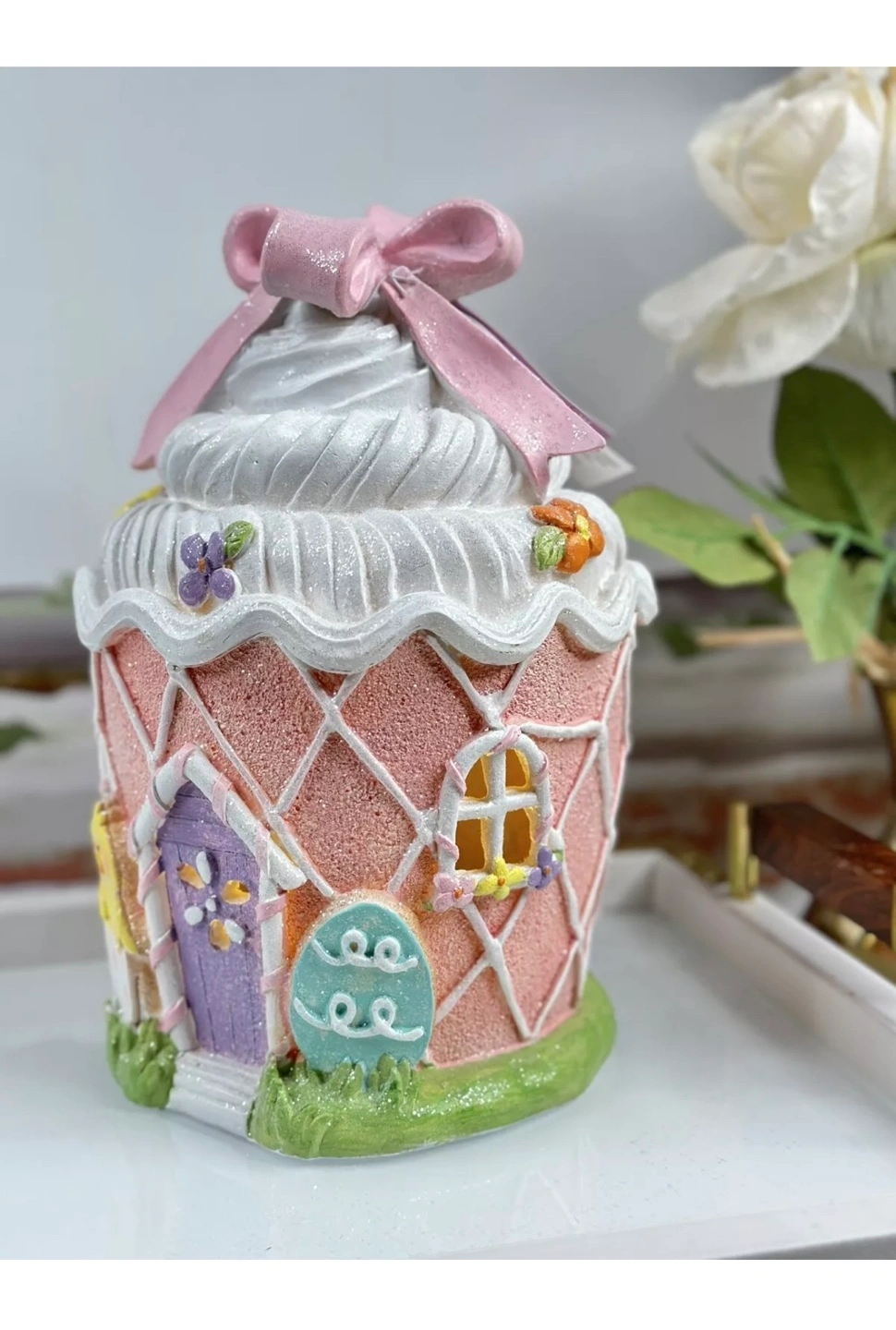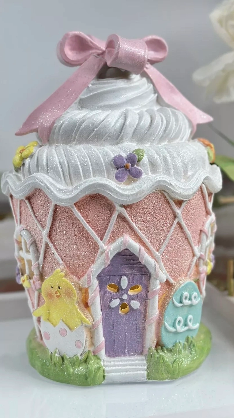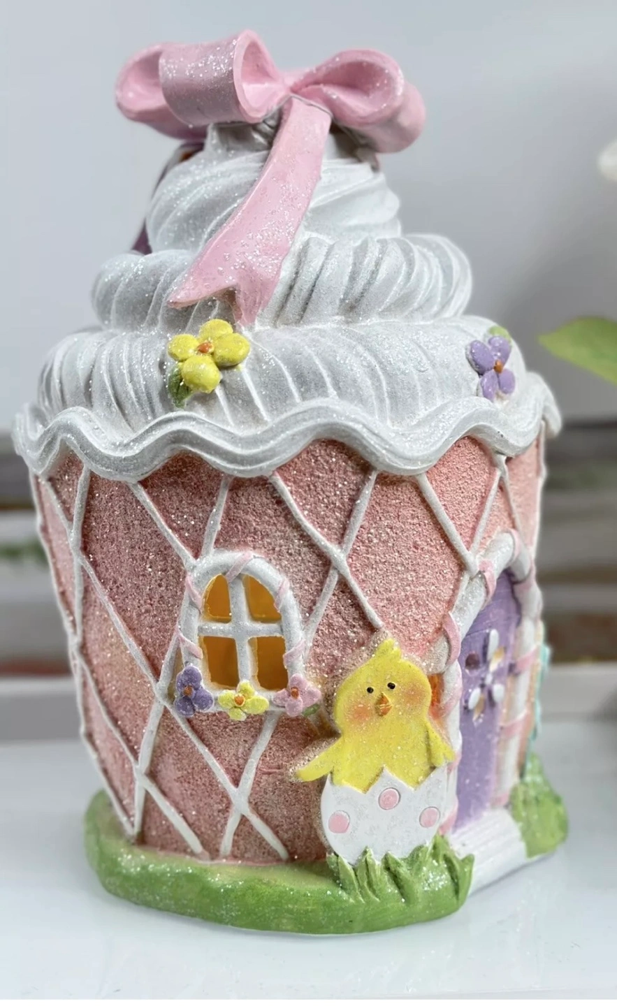 177Cute Easter cupcake house decoration. Features a pink bow, purple door, and little chick. Lights up.