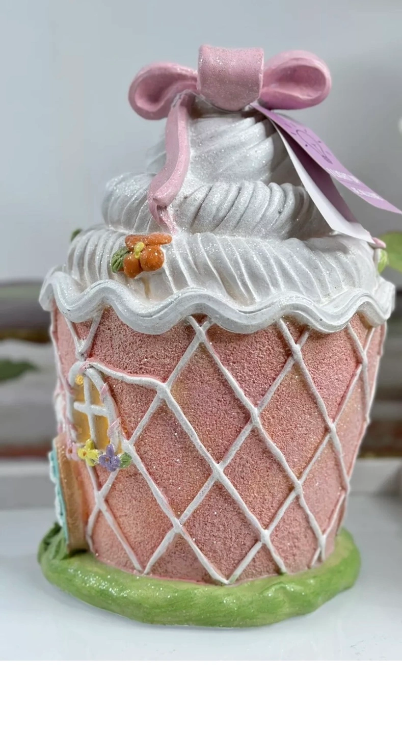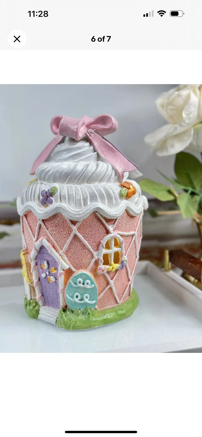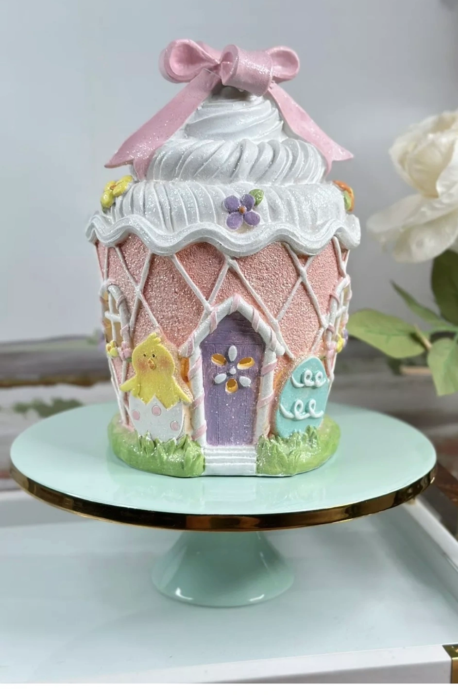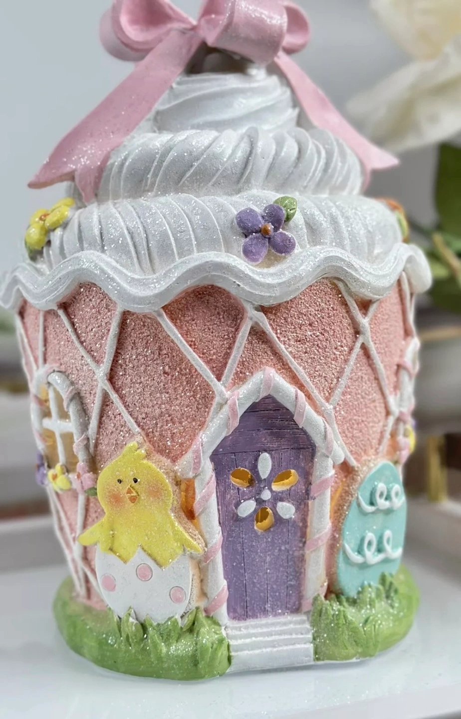 177Cute Easter cupcake house decoration. Features a pink bow, purple door, and little chick. Lights up.
