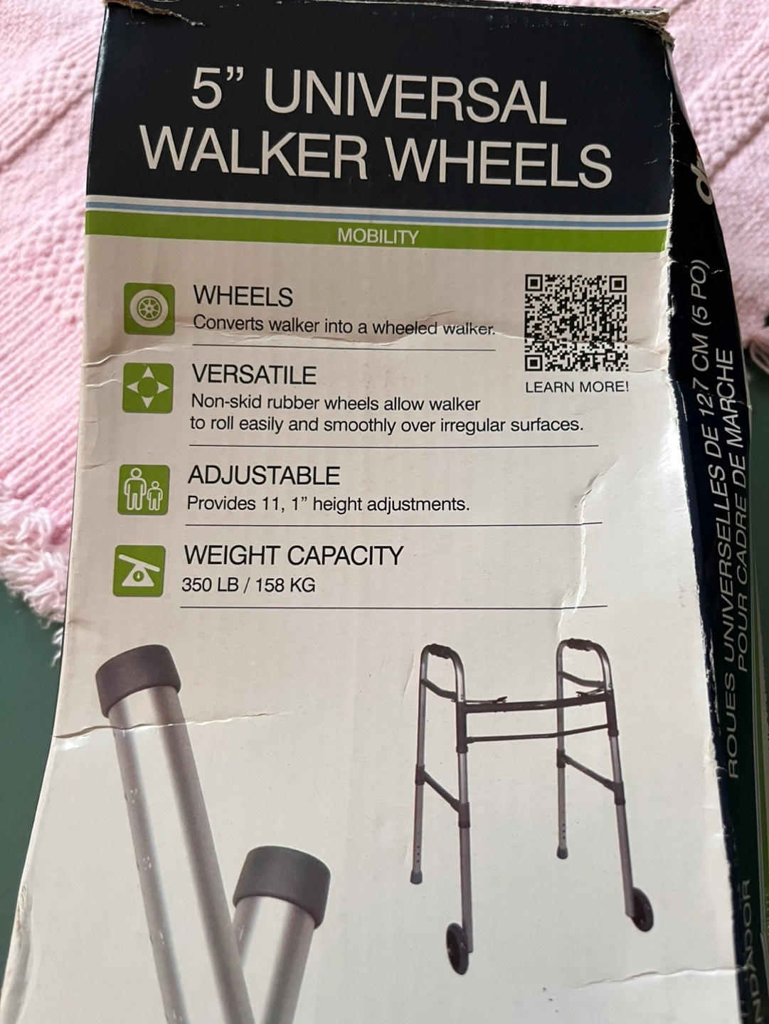 Converts walker into a wheeled walker. Non-skid rubber wheels allow walker to roll easily and smoothly over irregular surfaces. Provides 11, 1" height adjustments. 350 LB / 158 KG weight capacity.